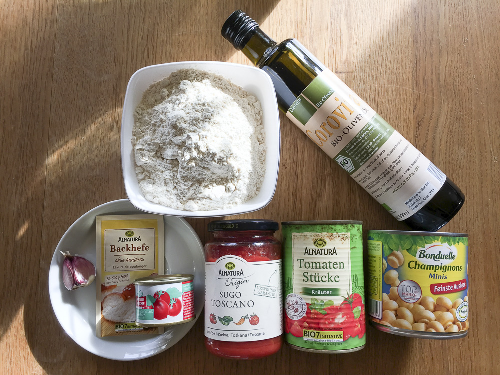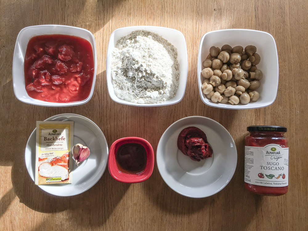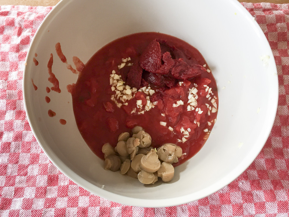 Den Knoblauch klein schneiden, die Soße, die Tomaten und etwas Olivenöl in eine Schüssel geben. Weitzer die Pilze, das Tomatenmark und die Gewürze dazub geben und alles verrühren und abschmecken. Reighenfolge ist egal – so lange abschmecken, bis man am liebsten die Schüssel gleich leer essen würde.