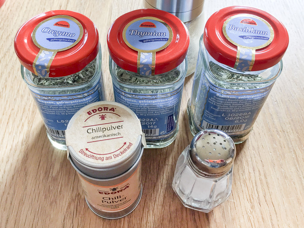 • Oregano, Basilikum, Thymian, Salz, Pfeffer, Chili