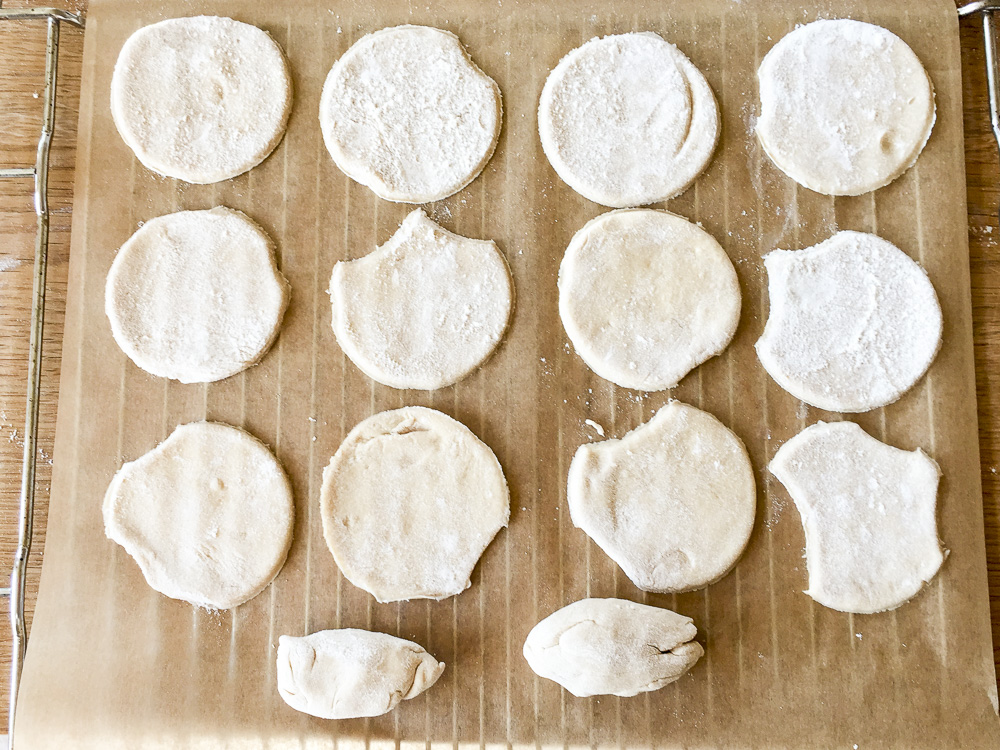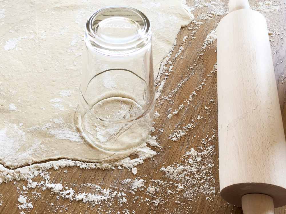 Dann den Teig auf dem Holztisch oder Brett, welches vorher mit Mehl eingepudert wurde ausrollen. Dicke ca. 0,5 bis 1cm und dann mit einem Glas runde Minipizzen ausstechen. Rest wieder ausrollen oder kleine Pizzabrötchen draus machen.