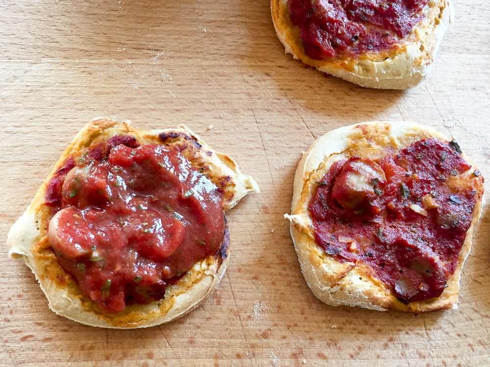 Die Minipizzen lassen sich einfach herstellen und man kann sie auf vier verschiedene Arten essen. Einmal mit Belag und Käse, einmal nur mit Belag, einmal mit dünnem Belag und extra Soße und einmal als Pizzabrötchen – dazu weiter unten mehr. Auf jeden Fall sehr lecker.