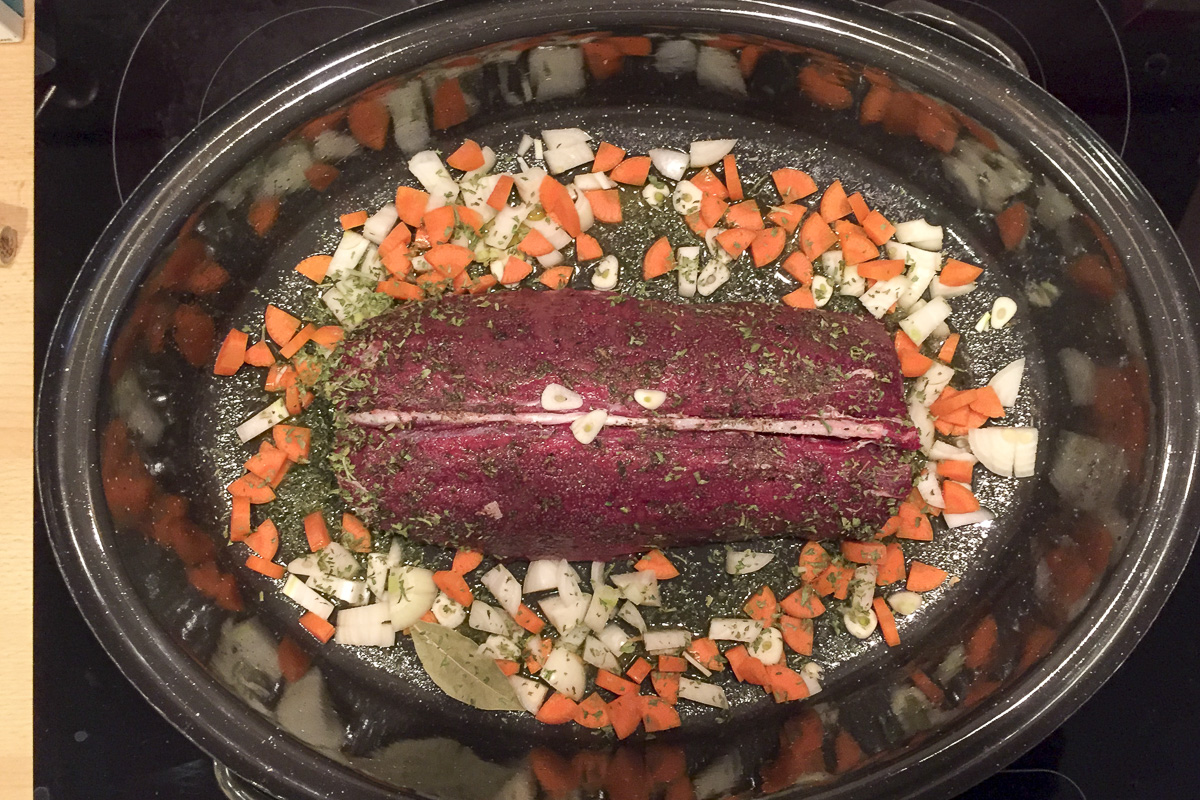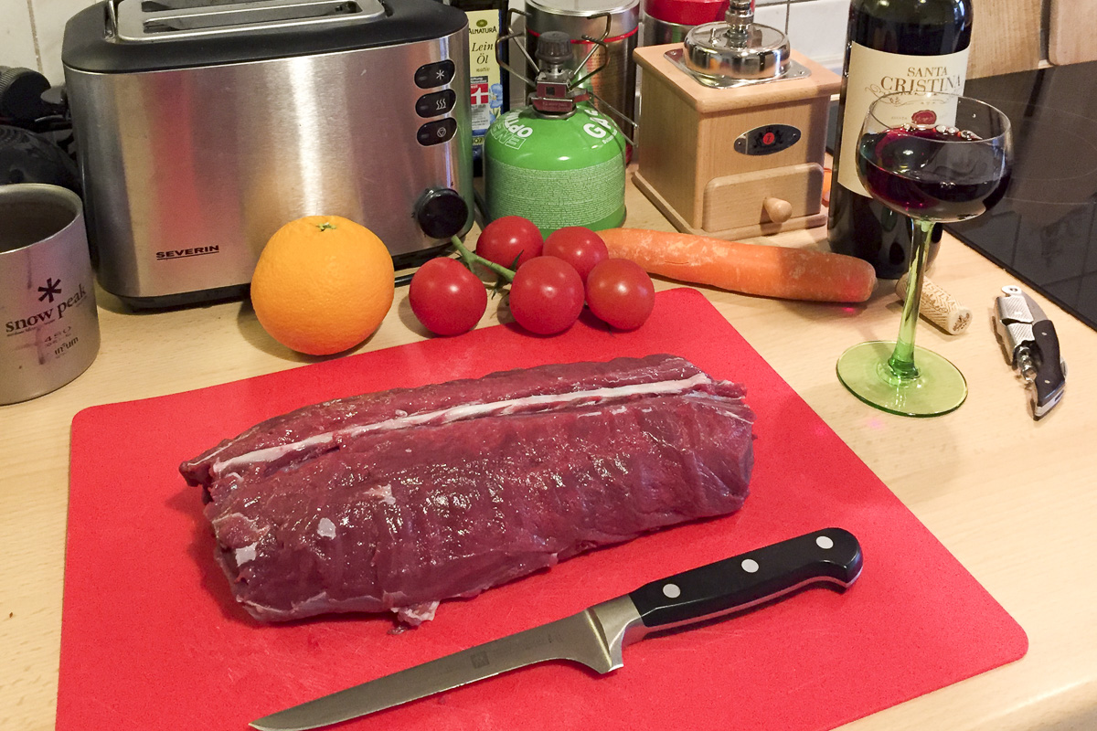 der vorbereitete Rehrücken – Rotwein passt auch schon zu diesem Zeitpunkt dazu 😉