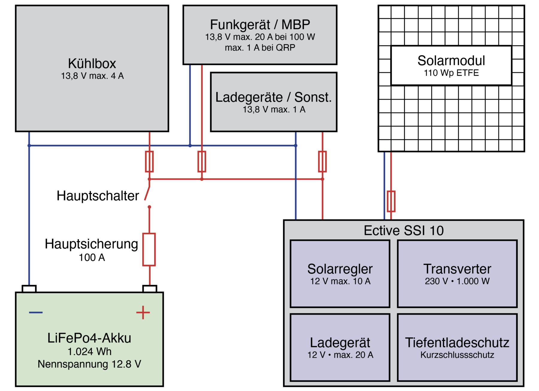 Hier die Zusammenschaltung aller Komponenten inkl. Solarmodul und Verbrauchern