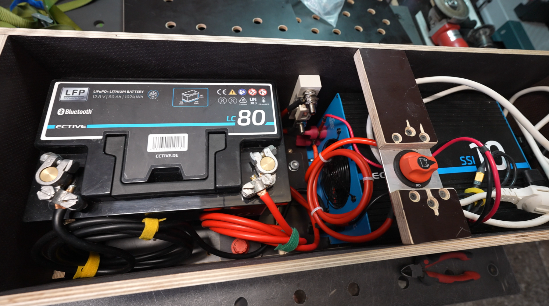 Im Bild ist die einfache Box zu sehen. Der stabile Boden trägt die schweren Elemente und eine Verbindungsstück in der Mitte hält den Kasten zusammen. Er ist gleichzeitig die Plattform für den Hauptschalter, den ich versenkt angebracht habe, damit man ihn nicht unbeabsichtigt ein- oder ausschalten kann. Wichtig sind vernünftige Kabelquerschnitte, damit das Ganze nicht abfackelt. Je nach Stromfluss und Länge der Zuleitung muss das Kabel gewählt werden.