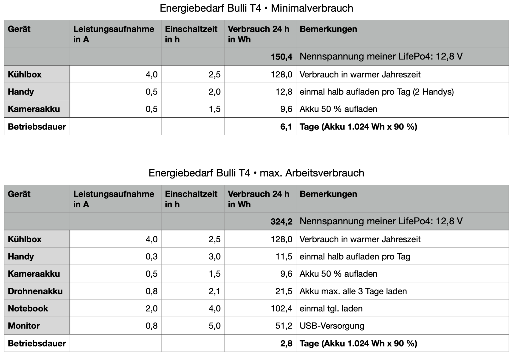 Hier der ermittelte Verbrauch in einer Minimal- und Maximalversion: