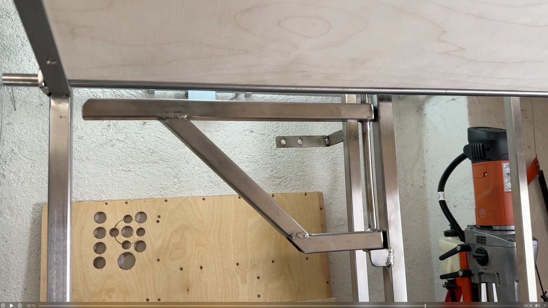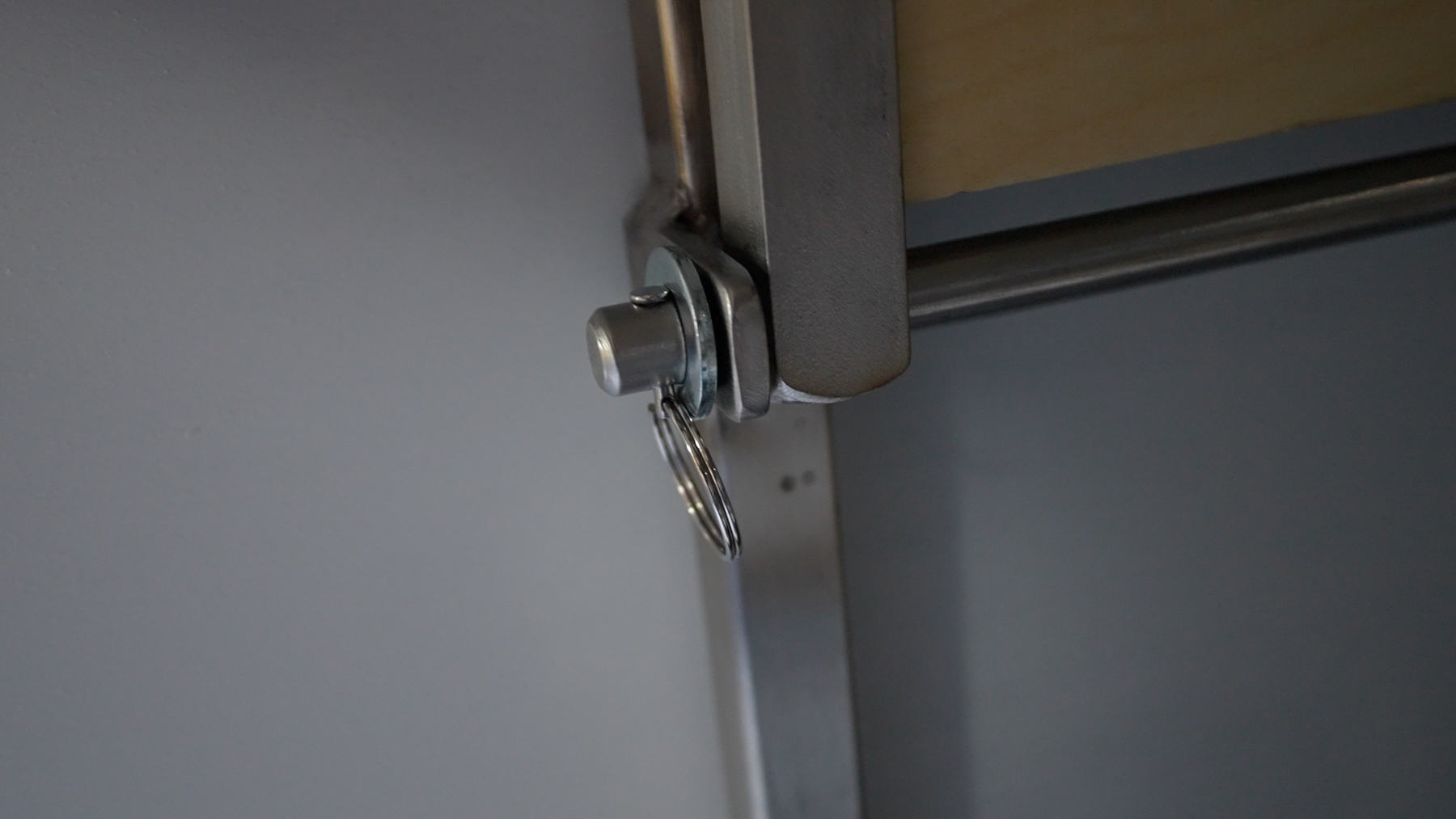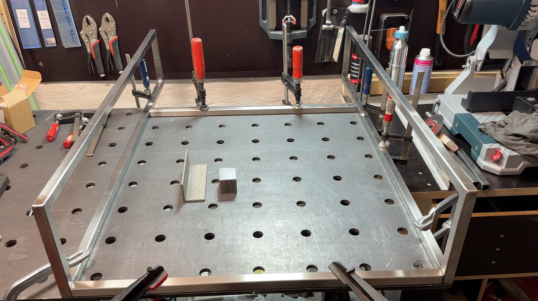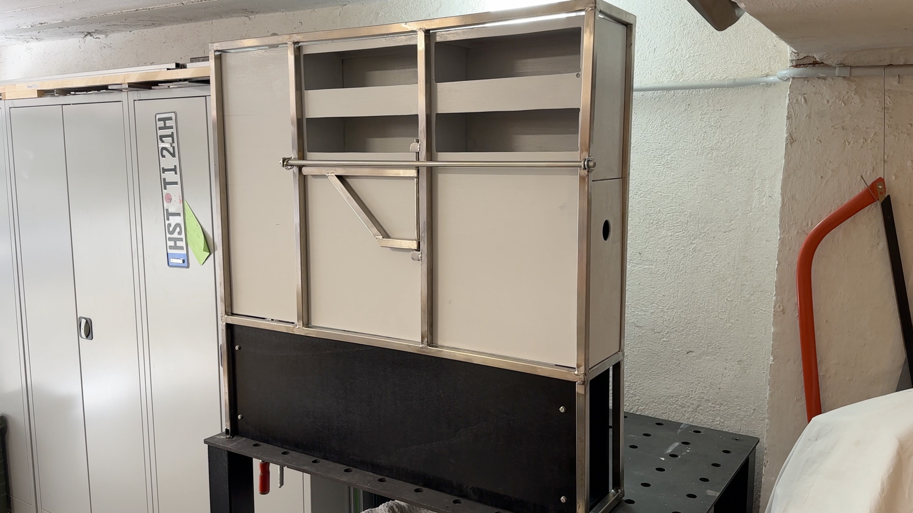 Gebaut wurde der Tisch wie auch die anderen Komponenten mit einem Edelstahlgestell. Innen wurde ein Kasten aus Sperrholz eingebaut und der Tisch ist aus einer Multiplexplatte mit Winkeleisen aus Edelstahl.