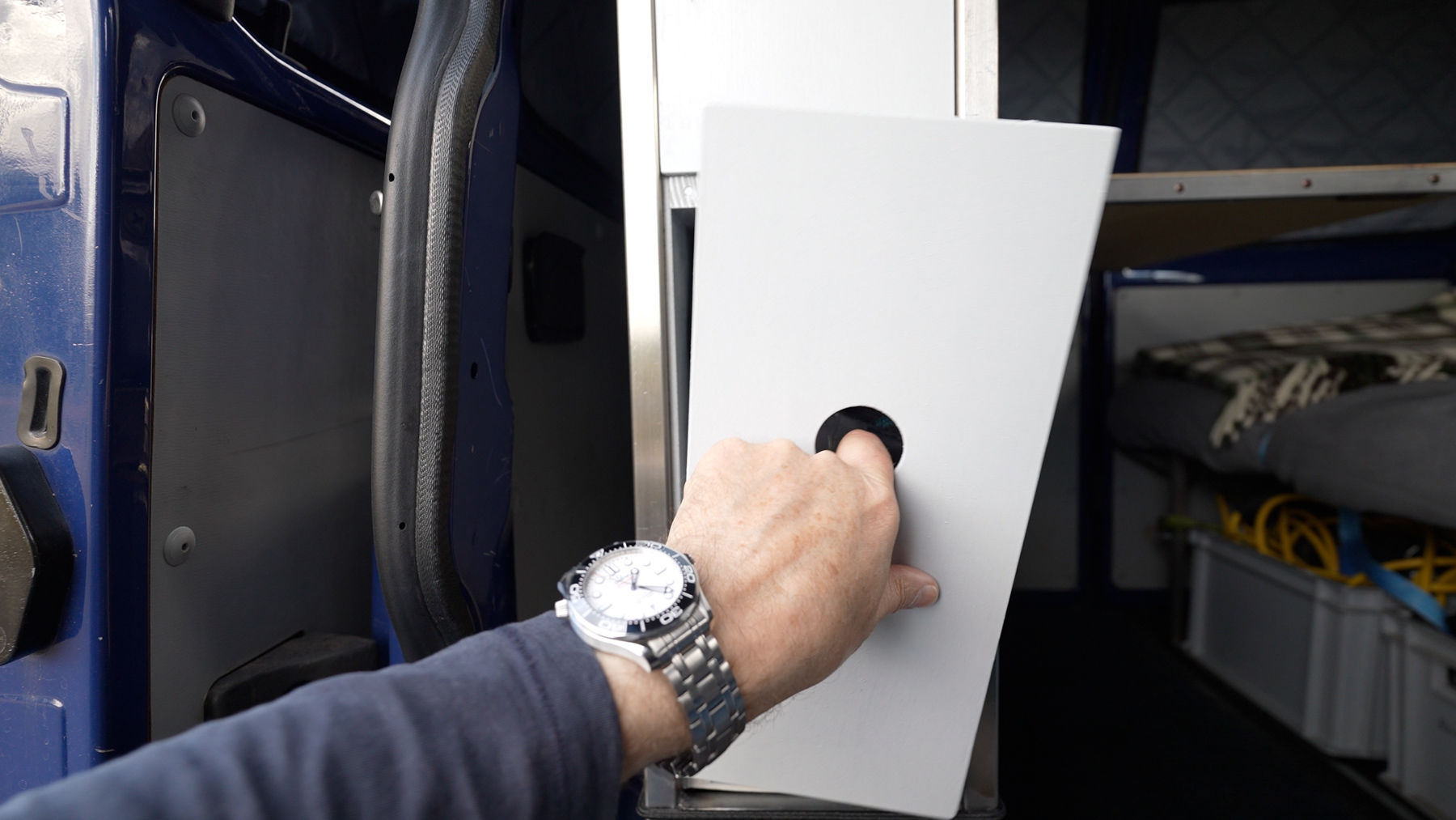 Da ich im Bulli auf jeden Fall einen ordentlichen Tisch benötige (Reisen, Funken, Arbeiten), sollte er auch immer einsatzbereit sein. Ich habe den Tisch an dem kleinen Schrank an der Seite befestigt, da dieser Schrank immer stehen bleibt und man dann auch zu zweit gut sitzen kann, wenn das zweite Bett weggeräumt ist. Das erste Bett dient als Sitz und man kann dort auch gemütlich herumsitzen 😉