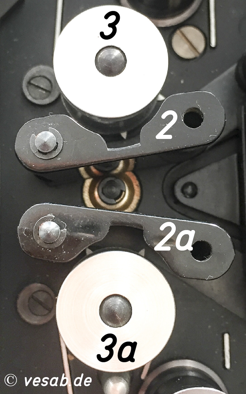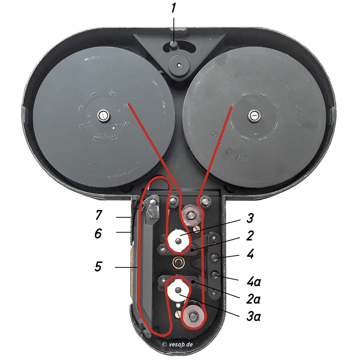 Von einer vollen Spule werden ca. 60cm Film abgerollt. Den Zähluhrknopf (1) nach rechts drücken, so dass die volle Spule auf den linken Zapfen gesteckt werden kann. Das abgerollte Filmende muss nach rechts unten zeigen. Die beiden Andruckkufen (2) und (2a) leicht zusammendrücken, bis sie einrasten. Dadurch werden die beiden Zahntrommeln (3) und (3a) freigegeben. Das Filmende wird so um die obere Zahntrommel (3) gelegt, dass die Zähne in die Perforation des Films eingreifen. Anschließend wird durch den Drucknopf (4) die Andruckkufe (2) an die Zahntrommel (3) gelegt.