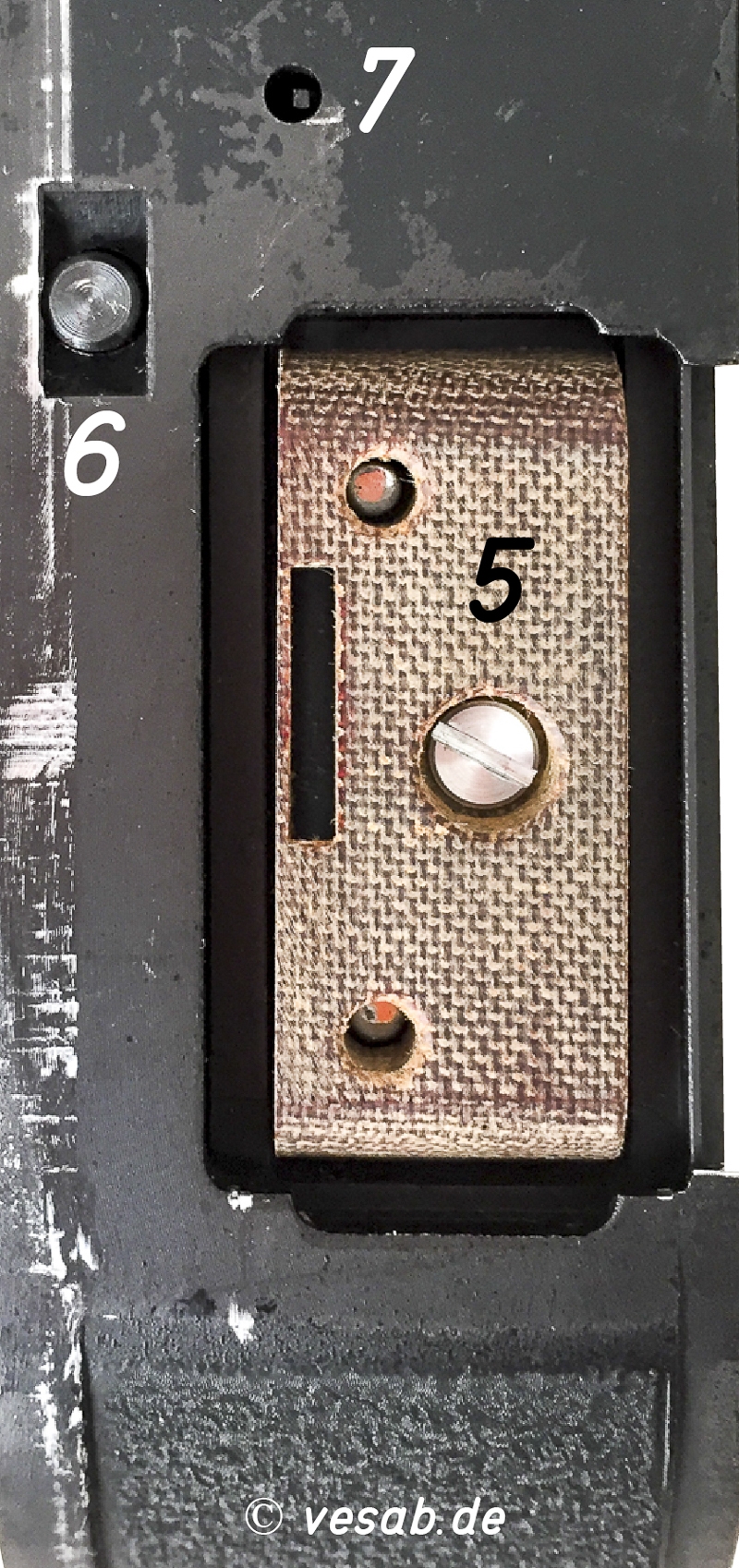 Der Film wird nun durch den Filmkanal (5) gesteckt, indem gleichzeitig der Entriegelungsknopf (6) gedrückt wird. Der Film muss so zu liegen kommen, dass der Stift (7) in die Perforation des Films greift und sichtbar ist. Den Film um die untere Zahntrommel (3a) führen – wieder drauf achten, dass die Perforation greift und mit dem Drucknkopf (4a) die Andruckkufe (2a) schließen. Anschließend den Film in den Kern der rechten Aufwickelspule einschieben und die Rolle aufsetzen.