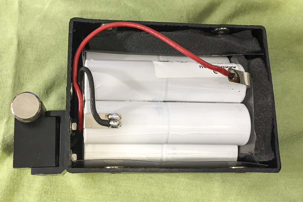 Akku verlötet und mit Schaumstoff ausgepolstert (alte Isolierscheiben sind eingelegt)