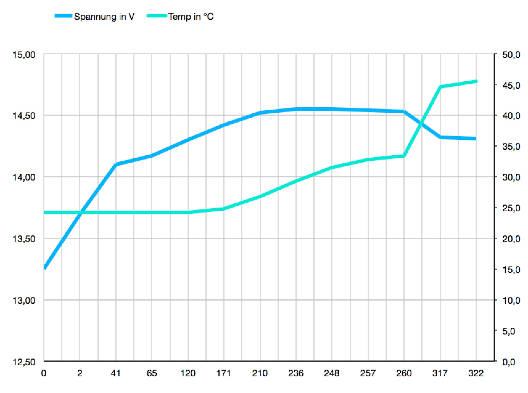 Nach ca. 4 Stunden und 20 min ist die Vollladung sicher erreicht (im Diagramm ersichtlich bei 260 min), wenn der Akku leer war. Maximum sind 5 Stunden, wobei der Akku dann schon zu warm ist, denn ich habe ja beim geöffneten Akku gemessen. Wenn man auf der sicheren Seiten bleiben will, lädt man einen leeren Akku 4 Stunden und Maximum sind 4,5 Stunden mit dem Originalladegerät.