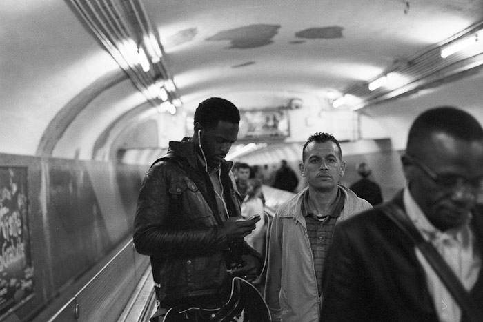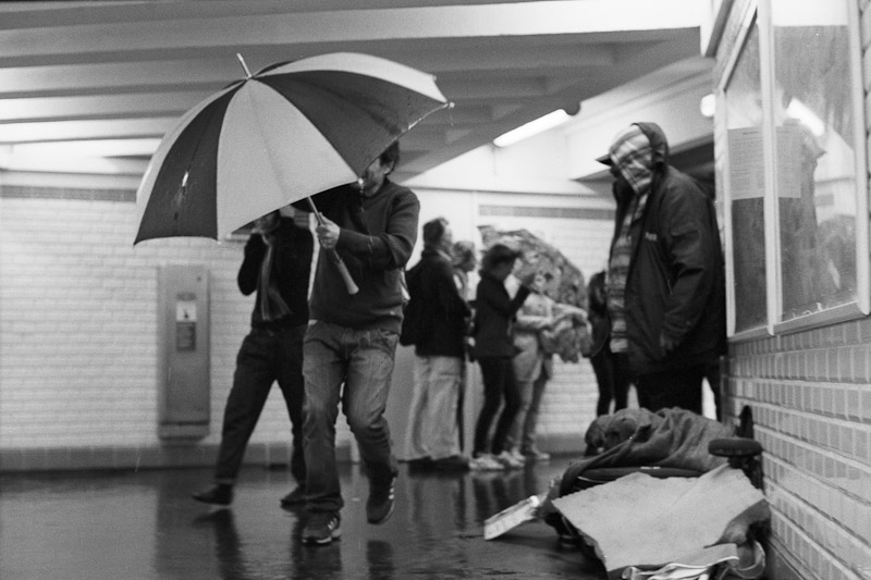 Nach meinem Experiment mit der Leica im Jahr 2010 habe ich mal wieder Unternehmungen in Sachen streetfotografie unternommen. Wie bisher nur mit der Leica MP und dem 50er Summilux. Viel Regen, volle Untergrundbahnen und sehr wenig Licht. Der 100er Tmax hat sich trotzdem wacker geschlagen. Abends kam dann der 400er zum Einsatz. Die Filme wurden auf meinem ATL800 entwickelt. Diesmal kam der originale Tmax-Entwickler zum Einsatz (1+4, 20 Grad, 8 min). Für die Internetbilder habe ich einen Plustek-Scanner verwendet. Wie immer gibt es keine Bildausschnitte, sondern die Entwicklung des kompletten Negativs.