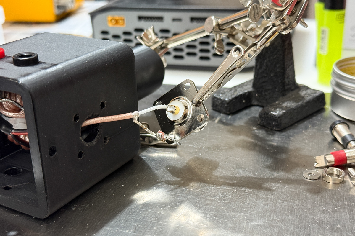 Nach dem Druck wird die Mantelwellensperre aufgebaut: RG316 wird auf einen passenden Ringkern (z. B. FT114-43) gewickelt, Anschlüsse werden hergestellt und für die mechanische Entlastung sinnvoll verlängert. An kritischen Stellen hilft ein kurzes Stück flexibles Silikonkabel zwischen Koax und Lötpunkt. Schrumpfschlauch sorgt für Zugentlastung und Isolation.