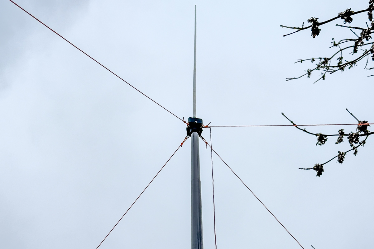 Eine Variante ist der vertikale Dipol: Oben der Teleskop-Strahler, nach unten ein Draht als zweiter Strahler, der am Gehäuse angeschlossen wird. Damit der Draht nicht herumschlägt, bindet man ihn unten leicht zur Seite an einer Abspannung fest, sodass er etwas Abstand zum Mast hält. Bei Kunststoffmasten ist das unkritisch.