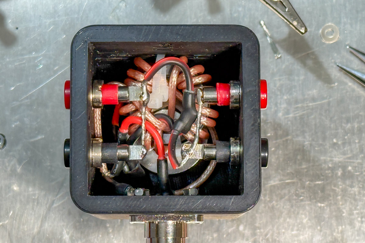 Nach dem Druck wird die Mantelwellensperre aufgebaut: RG316 wird auf einen passenden Ringkern (z. B. FT114-43) gewickelt, Anschlüsse werden hergestellt und für die mechanische Entlastung sinnvoll verlängert. An kritischen Stellen hilft ein kurzes Stück flexibles Silikonkabel zwischen Koax und Lötpunkt. Schrumpfschlauch sorgt für Zugentlastung und Isolation.