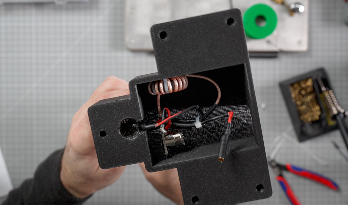 Im Gehäuse werden die Anschlüsse so aufgebaut, dass die „strahlenden“ Leitungsstücke kurz bleiben. Der Mittelpin der PL-Buchse geht auf die Strahlerseite, der Schirm/Masse wird sauber auf Masse geführt. Oben wird der Anschluss für das Teleskop hergestellt, unten für den Drahtstrahler. Kabelschuhe und kurze, flexible Zwischenstücke helfen, mechanische Belastung an Lötstellen zu vermeiden.
