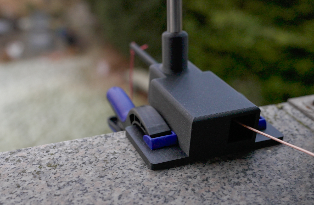 Am Fensterbrett wird der Halter mit zwei Klemmen befestigt. Anschließend die Sicherungsbänder nach innen führen und dort fest anbinden. Vor dem Betrieb prüfen: Sitz der Klemmen, Sicherung, freie Führung des Drahtes nach unten, keine scharfen Kanten am Koax.