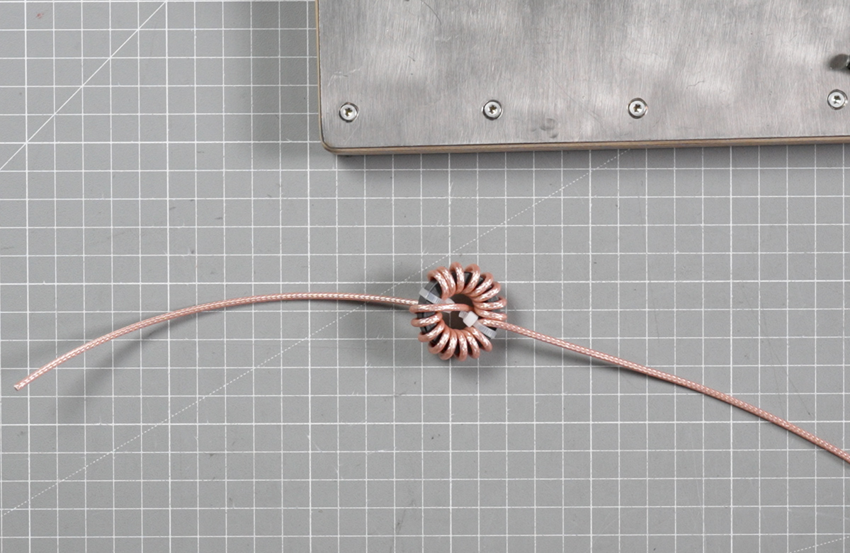 Für die Mantelwellensperre werden ein FT114-43 Ferritkern und RG316 Koax verwendet. Das Koax wird in mehreren Durchführungen durch den Kern gewickelt (in der Praxis so, dass beide Kernhälften gleichmäßig belegt sind). Zum Fixieren helfen kleine Kabelbinder. Im Aufbau wurde eine sehr gute Dämpfung um 27 MHz erreicht (Beispielwert: ca. -35 dB).