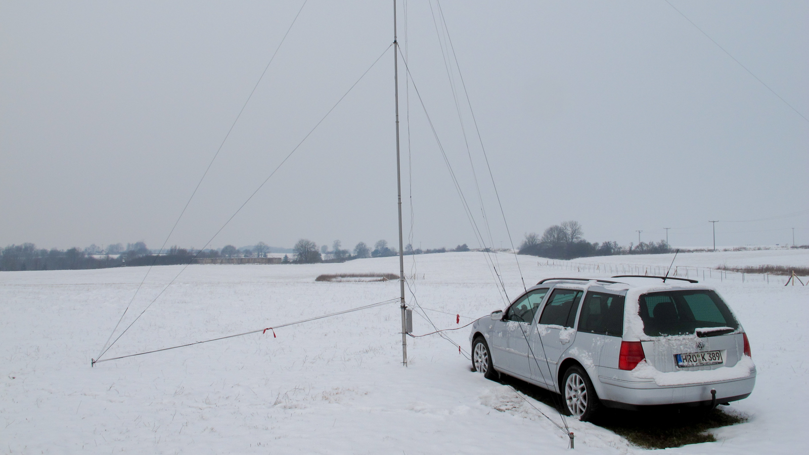 Man kann mit jeweils 3 oder 4 Abspannungen arbeiten. Besser sind 4 Abspannungen, wenn man die Klappmethode wählt. Beim Hochschieben der Antenne reichen auch 3 Abspannungen.