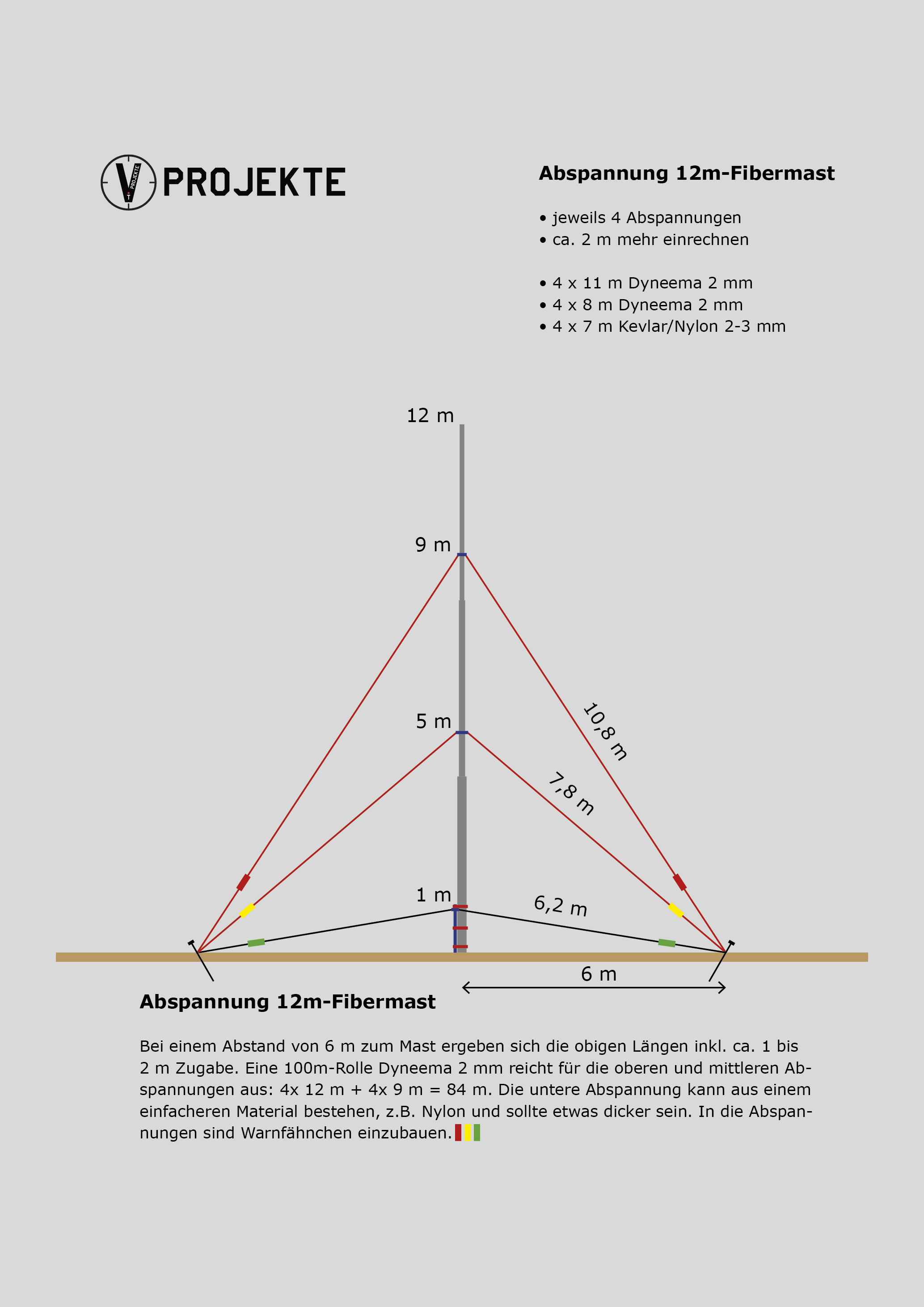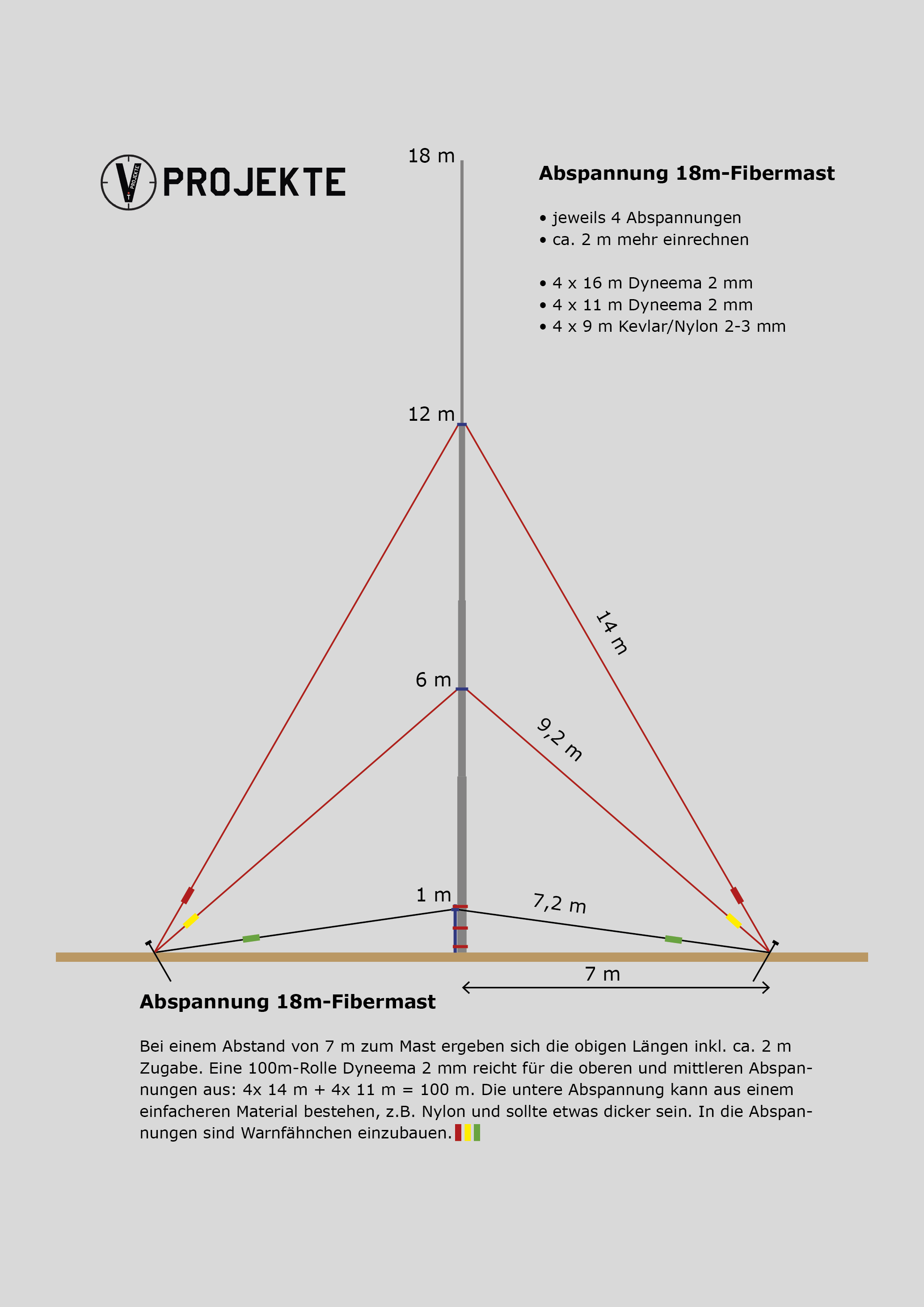 Nachfolgend die Abspannmaße für einen 18m-Mast und einen 12m-Mast. Ein 10m-Mast kann wie der 12m-Mast abgespannt werden, evtl. geht man 1 Element tiefer.
