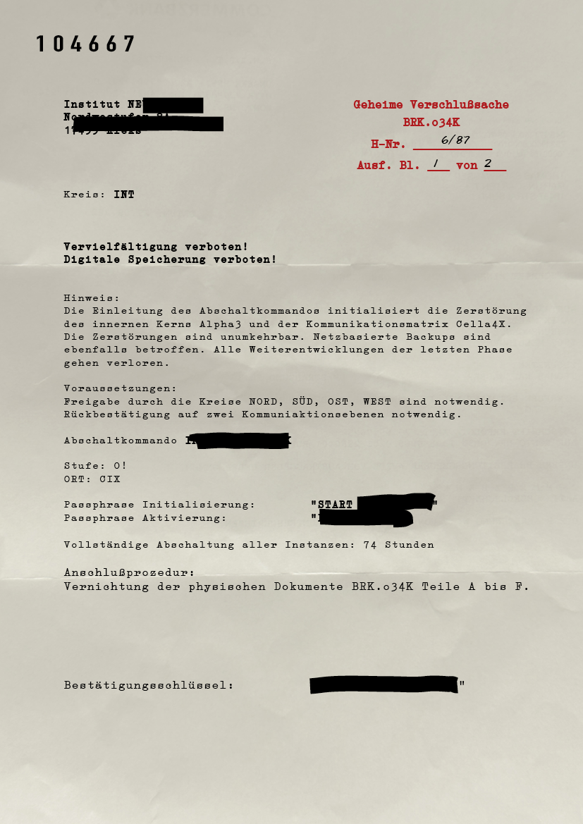Im Netz ist ein Dokument aufgetaucht, welches augenscheinlich von dem Entwicklerteam der KI stammt und dieses Dokument zeigt die Möglichkeit auf, die KI abzuschalten. Leider sind Teile des Dokumentes nicht vollständig lesbar und es existieren verschiedene Kopien des Dokuments, welche an immer anderen Stellen geschwärzt sind. Die Ursache dafür scheint Folgende zu sein: Für das Abschalten der KI sind 4 verschiedene Teams notwendig, die jeweils einen Teil des Schlüssels kennen. Leider ist das nicht alles. Die Abschaltung unterteilt sich in zwei Handlungen: