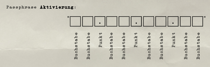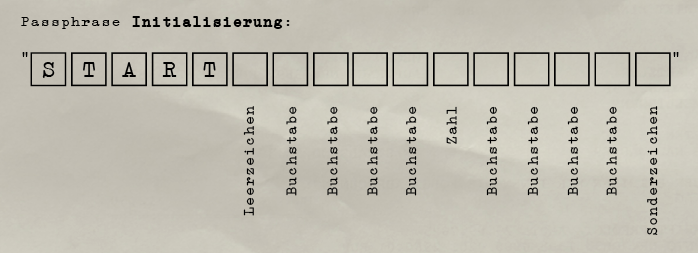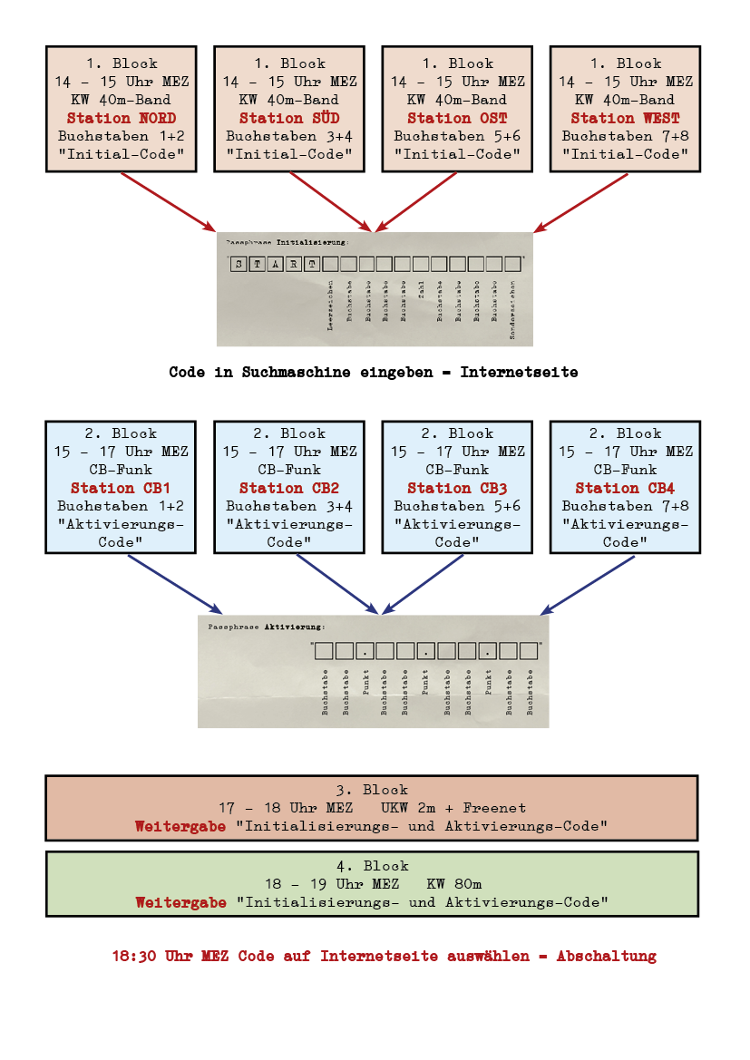 Im ersten Frequenz- und Zeitblock (KW 40m-Band) werden 4 KW-Stationen aus Nord-, Süd-, Ost- und Westdeutschland einen Teil des ersten Codes „Passphrase Initialisierung“ versuchen an die Leitstationen zu übergeben. Die Leitstationen werden versuchen diesen Code an alle KW- und SWL-Stationen weiterzugeben. Dazu sollten so viele Stationen wie möglich versuchen, die Leitstationen zu erreichen. Diejenigen, die den Code haben, sollten sofort versuchen, die Internetseite zu finden und evtl. noch einmal eine Rückmeldung geben, ob diese Seite auffindbar ist. Ziel ist das Auffinden der Internetseite über den Code „Passphrase Initialisierung„. Man tippt einfach den kompletten Code in eine Suchmaschine ein. Der Code sieht wie folgt aus: