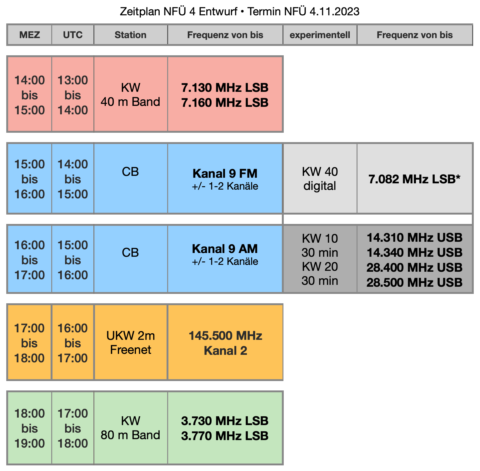 Hier der Zeitplan in MEZ und UTC und die zugehörigen Frequenzblöcke: