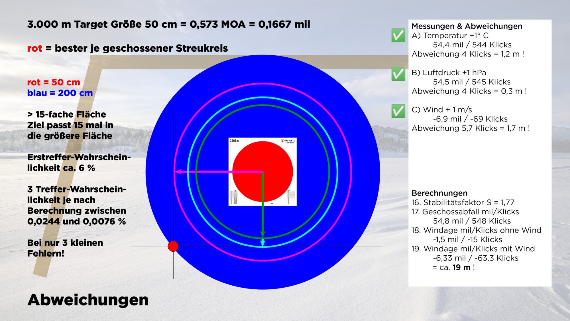 Anschließend nur 3 mögliche Abweichungen ggü. der Berechnung. Im realen Leben gibt es deutlicxh mehr Abweichungen, z.B. die unterschiedlichen Pulvermengen (ausgedrückt in der SD der V0) oder Zündhütchenschwankungen und vieles mehr. Nachfolgend nur 3 mögliche minimale Fehlmessungen vor Ort: