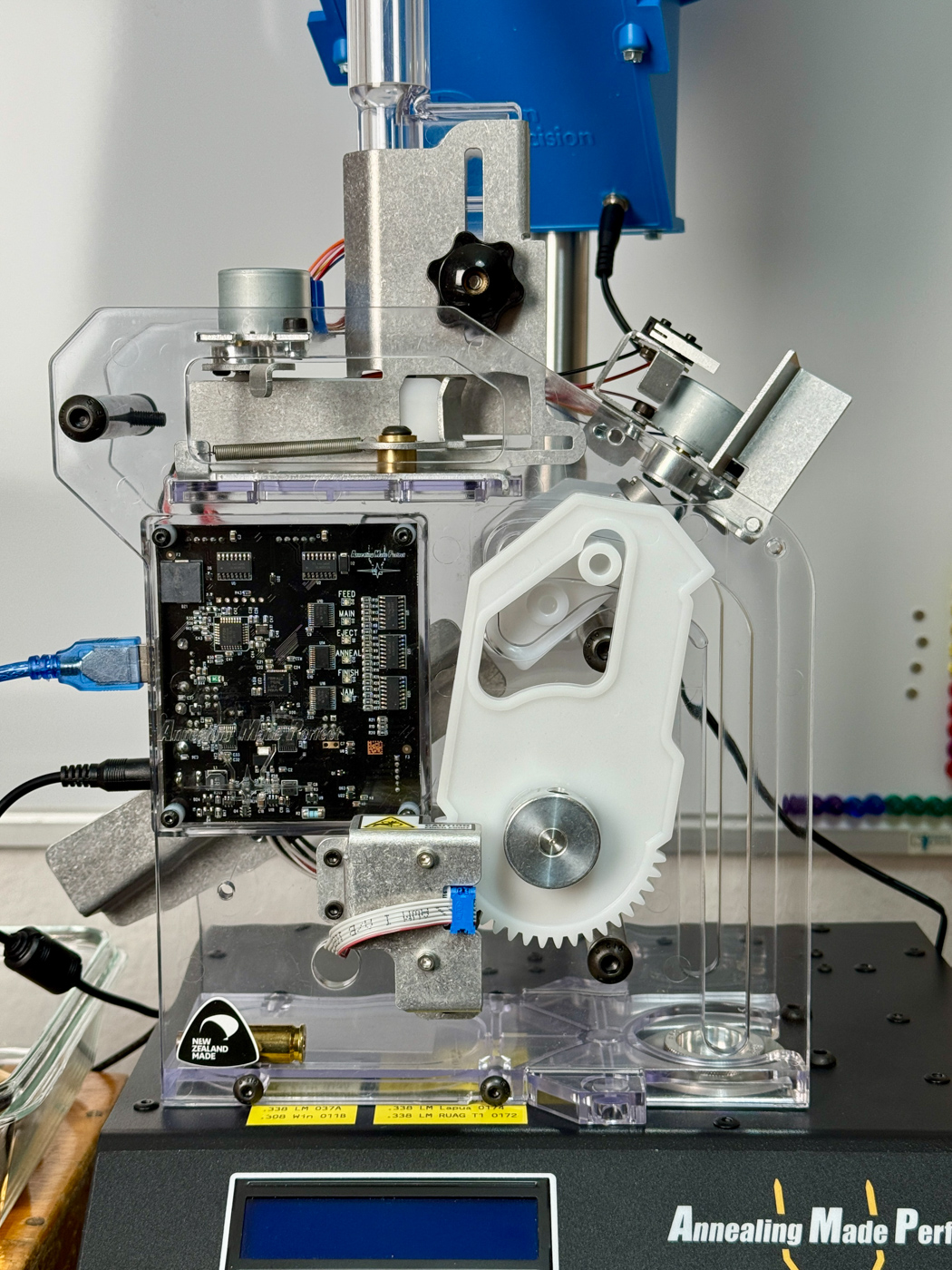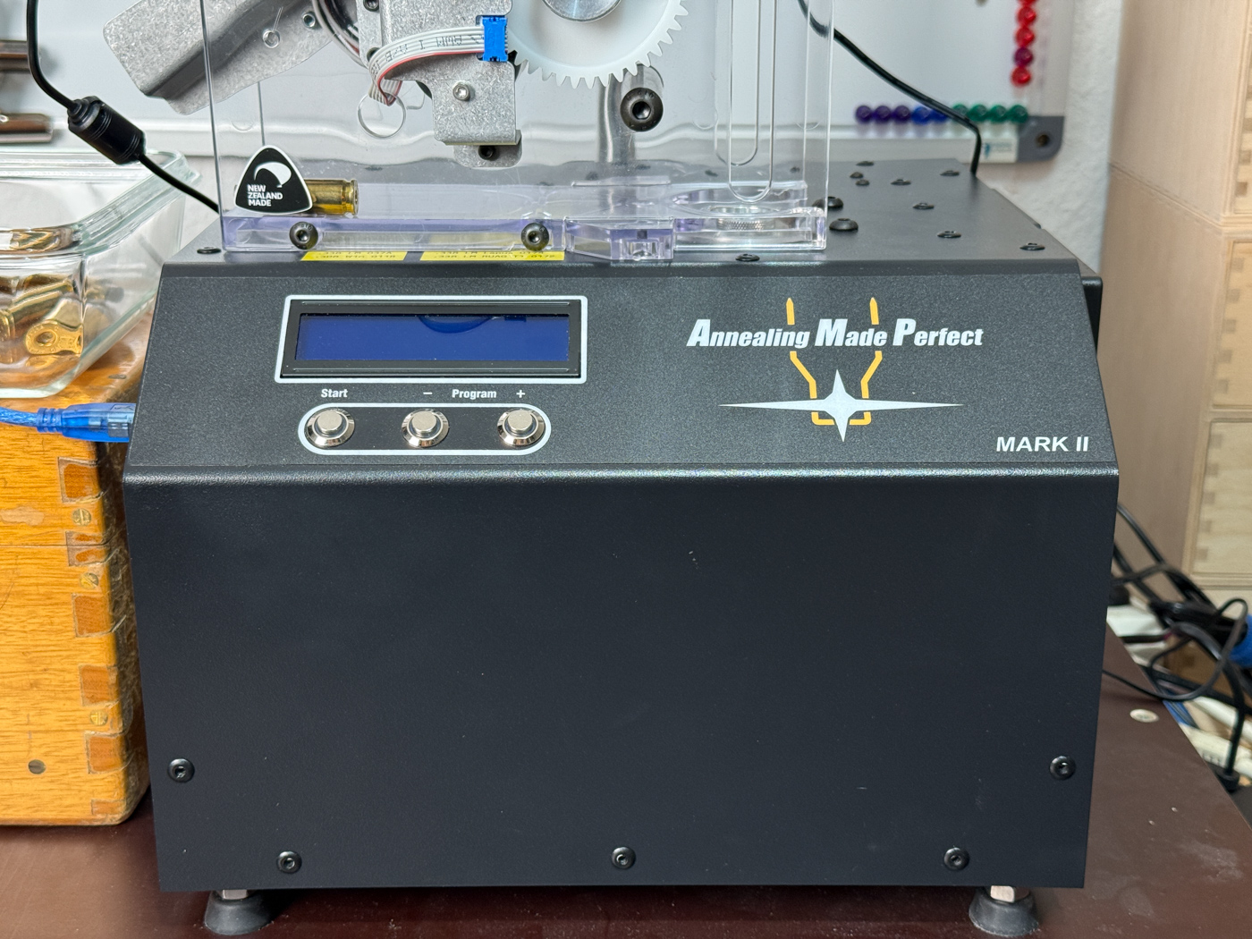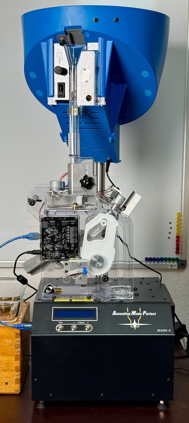 - Casefeeder-Ständer (z. B. 1″-Alurohr auf Grundplatte) neben/hinter dem Annealer aufbauen.