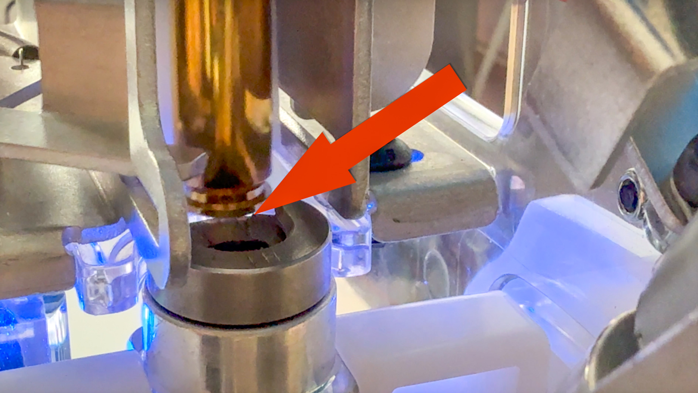 - Test: Den weißen Schieber mit der Hülse bis vor den Shellholder fahren. Die Hülse muss ohne Hakeln und ohne Kantenstoß in den Shellholder gleiten.
