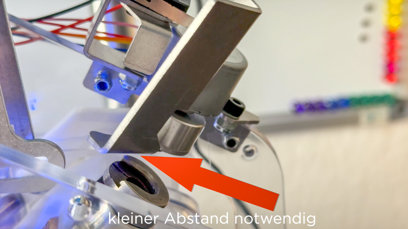 - Im nachfolgenden 1. Bild sieht man den Auswerfer rechts (Winkelblech, welches sich bewegt). Im Video gibt es einen Hinweis mit Bild und Pfeil, worauf zu achten ist. Im zweiten Bild ist die Stelle markiert (Pfeil), die es zu beachten gilt.