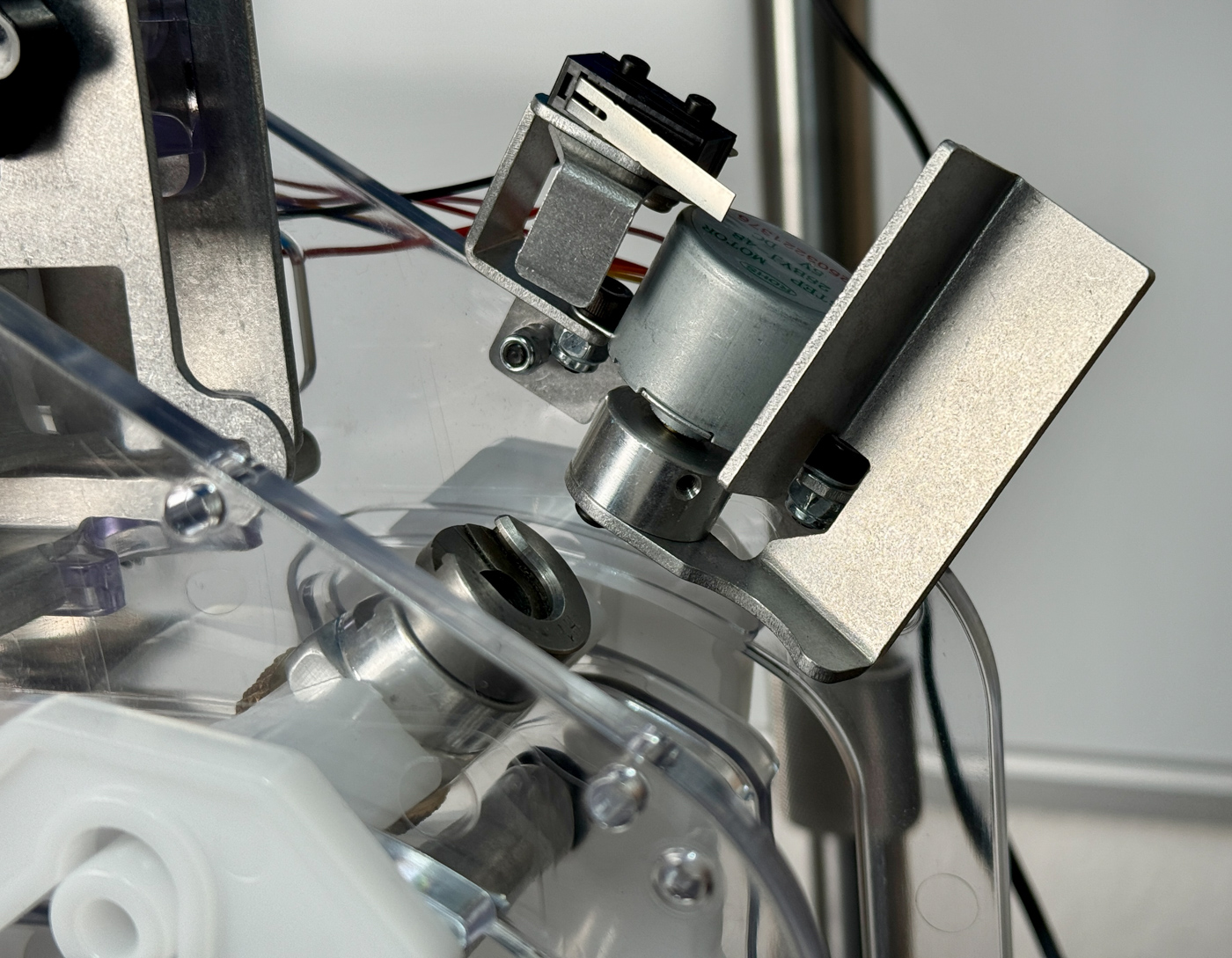 - Von oben in den Feed Guide schauen und die Anschlagschraube (hinten am Amp Mate) heraus- oder hineindrehen, bis der weiße Schieber im Guide gerade eben sichtbar ist.