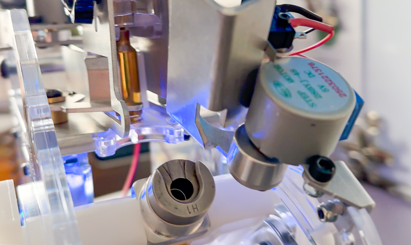 - Der Schlitten mit Shellholder fährt in den Annealer, die Hülse wird in den Pilot geschoben.