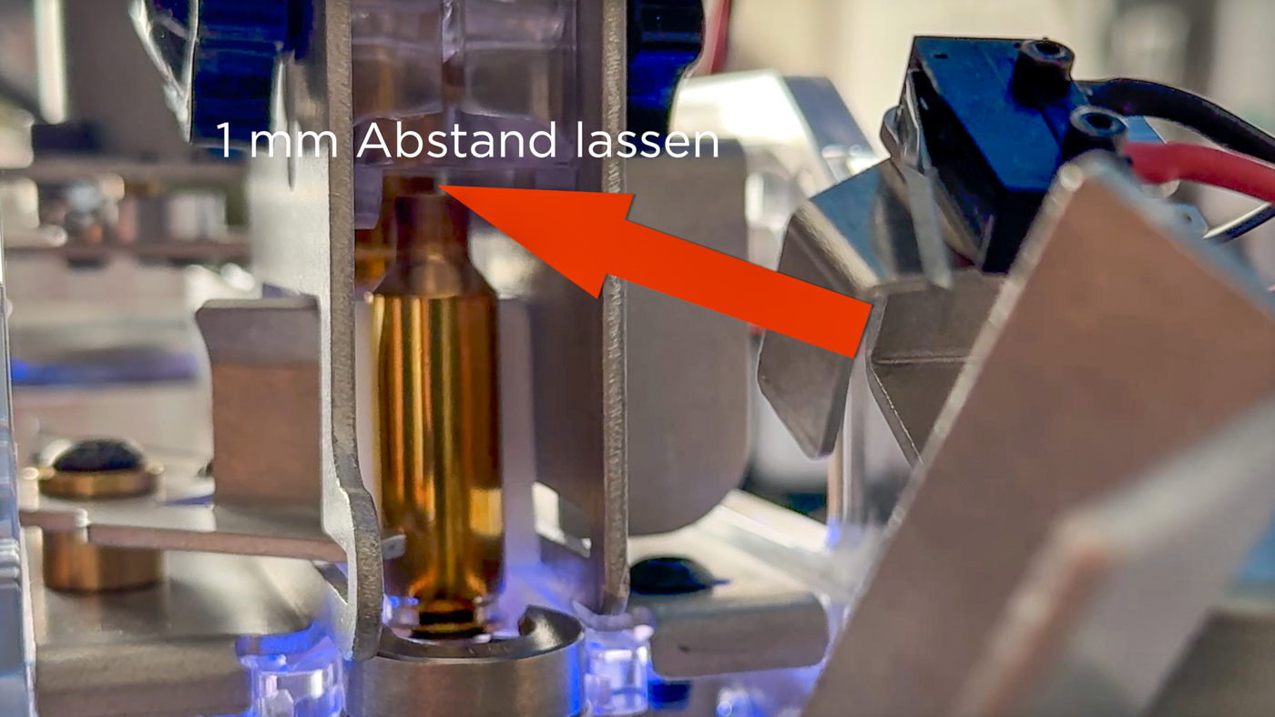 - Den Feed Guide in der Höhe so einstellen, dass der Hülsenmund etwa 1 mm unterhalb der Unterkante des Guides steht und sicher im Schlitz geführt wird (siehe Video).