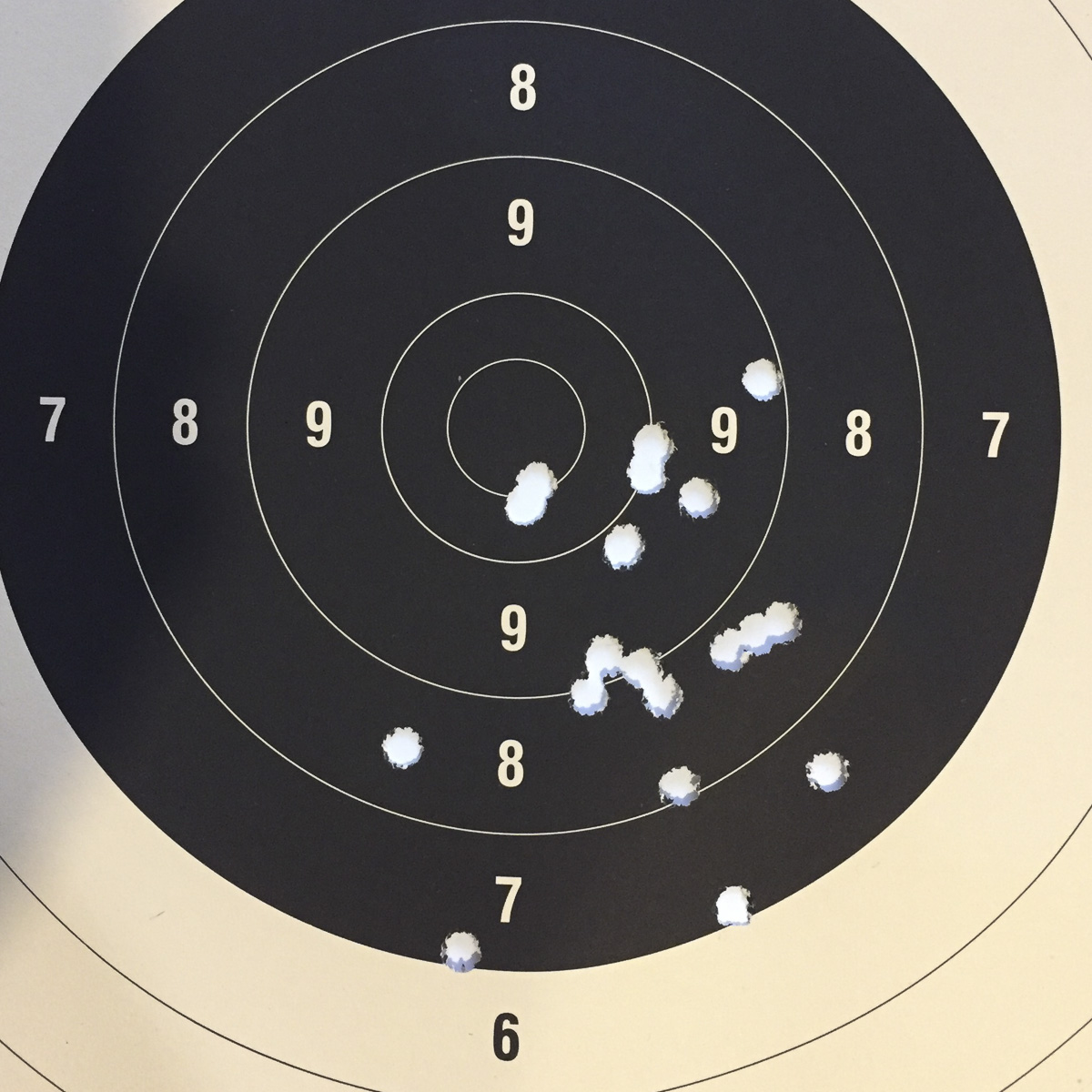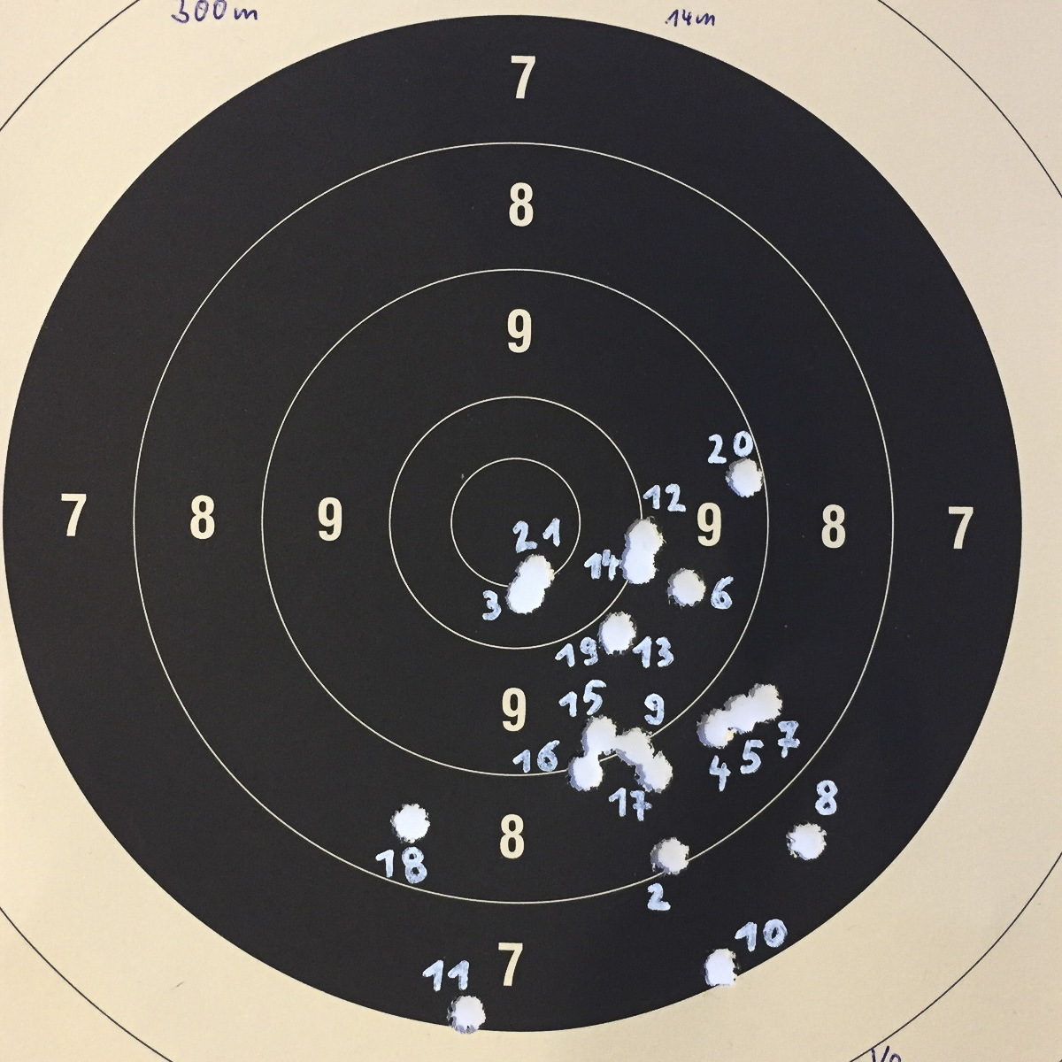 Die 5 Treffer zwischen 12 und 16 liegen 38mm auseinander und sind als Basis gut zu gebrauchen. Die 9 liegt auch noch innerhalb dieses Streukreises, die 8 und 10 sind fast drin, nur die 11 liegt etwas außerhalb. Schützenfehler sind natürlich auch immer vorhanden.