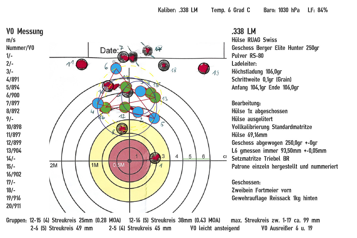 Anschließen erfolgt die Auswertung der Treffer – man sucht aufeinanderfolgende Treffer, die möglichst dicht beieinander liegen. Diese zusammenliegenden Treffer sind ein Indiz für ein gutes Schwingungsverhalten des Laufes, d.h., in diesem Bereich ergeben kleine Abweichungen der Pulvermenge nur eine geringe Treffpunktabweichung. Leider gibt es dabei einige Störfaktoren, so dass die Auswertung manchmal nicht oder nur schlecht möglich ist. Manchmal ergeben sich auch nicht auswertbare Trefferbilder. Folgende Ursachen können Einfluss haben:
