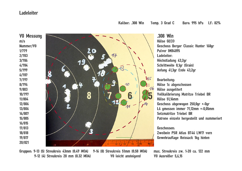 Die 5 Treffer zwischen 9 und 13 liegen 43mm auseinander und sind als Basis gut zu gebrauchen. Selbst die Treffer zwischen 9 und 16 sind noch akzeptabel (8 Schuss). Als Ausgangsbasis für die fertige Ladung wäre nun die Nummer 11 mit 42,3 Grain IMR4895 sinnvoll.