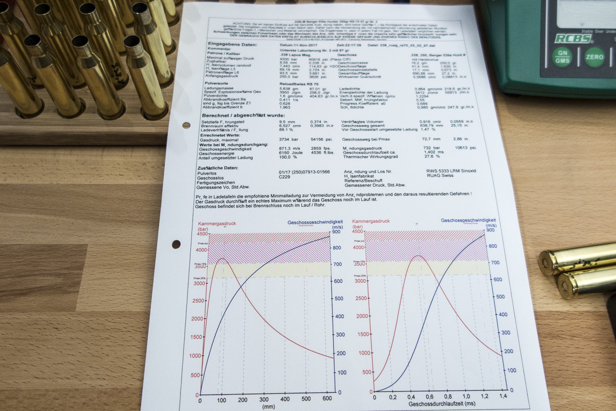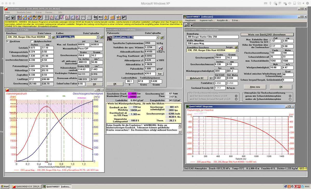 Mit diesen Werten und den zus. Vorgaben kann man relativ genau rechnen. Trotzdem darf man sich nicht allein auf das Programm verlassen. Die minimalen und maximalen Ladungsparameter der Patrone dürfen nicht unter- bzw. überschritten werden.