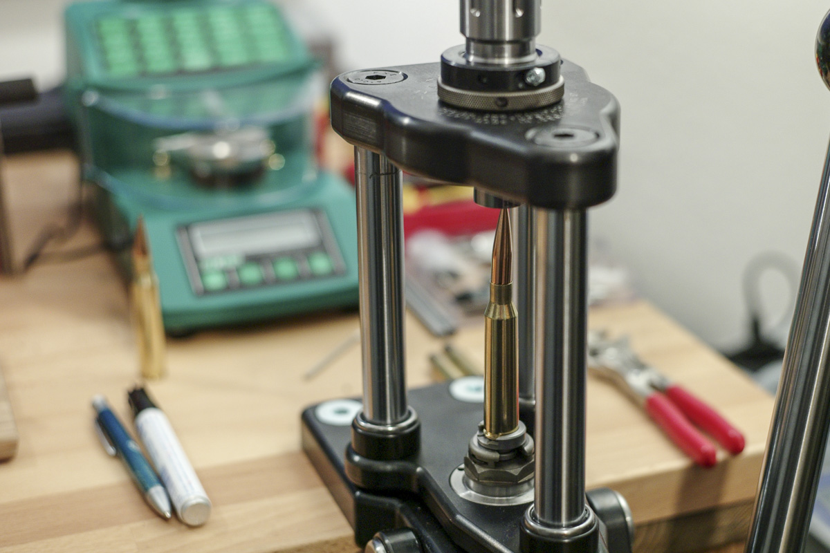 Ist das Pulver eingefüllt, kann das Geschoss mit einer Geschosssetzmatritze auf die Hülse gesetzt werden. Die zuvor ermittelte OAL der Patrone sollte hierbei genau eingehalten werden. Dafür das Geschoss anfangs höher setzen und sich dann an die richtige Setztiefe herantasten.