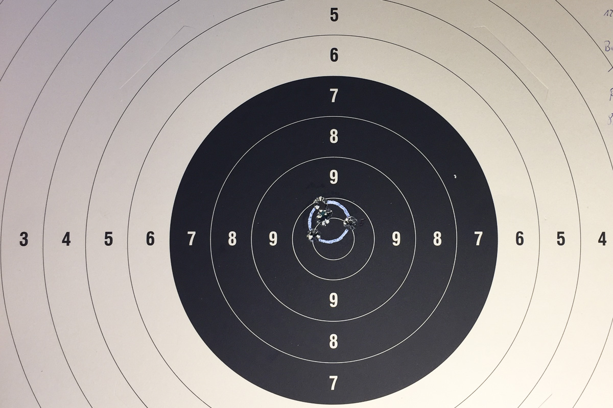 Hier noch nicht optimal. Der Streukreis bei 5 Schuss beträgt 25mm, also 0,86 MOA, bei den ersten 4 Schuss 20mm, also 0,69 MOA. Die hintere Auflage war nicht optimal. Das Ergebnis wurde mit der mittleren Ladung erreicht. Die beiden anderen Ladungen erzeugten Streukreise von 25mm und 29mm. Gemessen wurde mit einer Streukreisschablone.