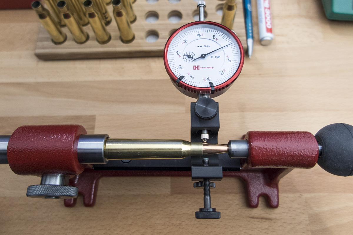 Vor dem Schuss sollte der Rundlauf des Geschosses geprüft werden. Mit einer Messuhr kann die Abweichung des Geschosses geprüft und ggf. angepasst werden. Am Ende sollten max. Werte zwischen einem und zwei Tausendstel Zoll erreicht werden.