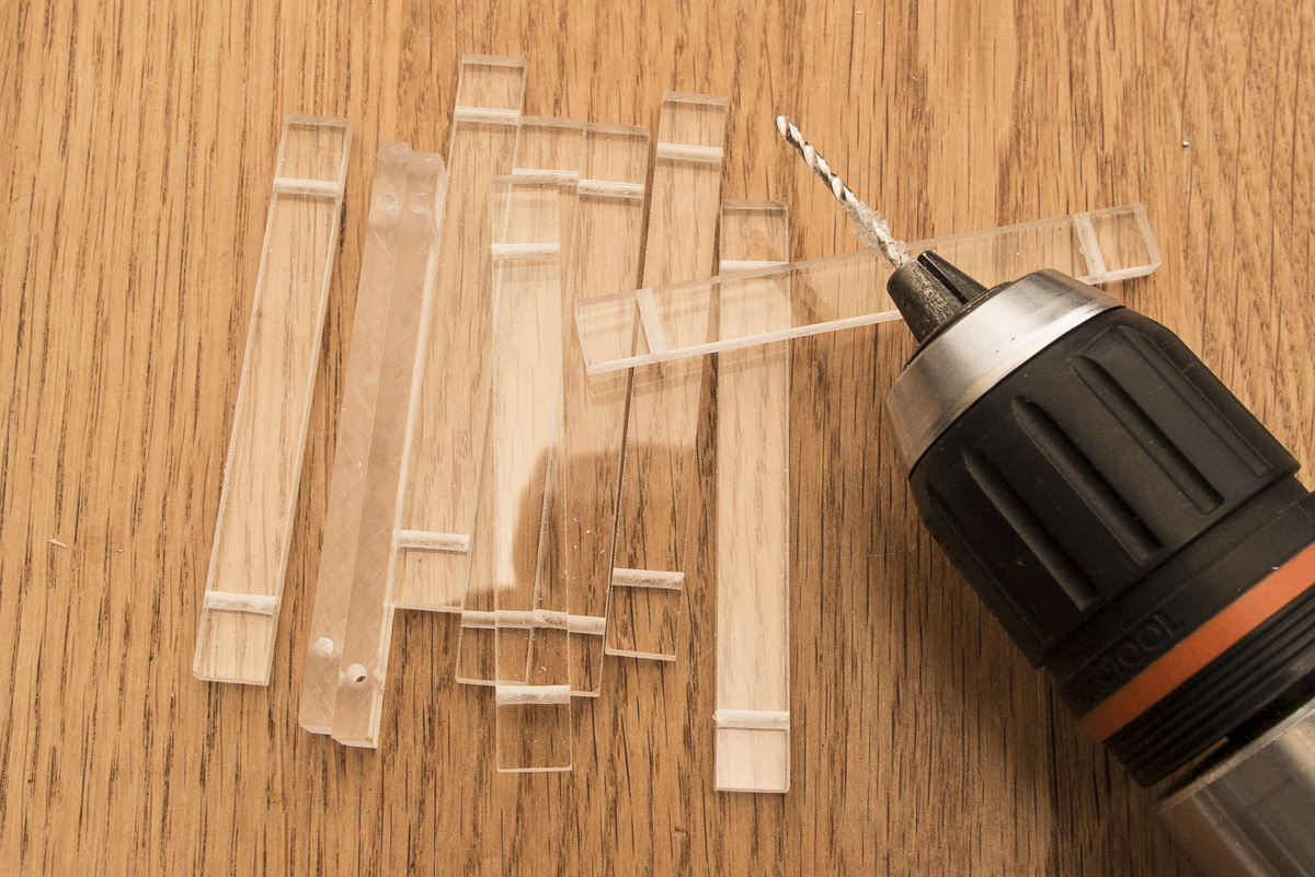 Die Teile anschließend auf der Schmalseite durchbohren. Wird das Plattenmaterial zu dünn gewählt, brechen die Enden ab, weil das Restmaterial nicht stabil genug bleibt. Auf den Bildern ist schon das Minimum zu sehen. Das Loch hat 2mm Durchmesser und die Platte ist 5mm dick. Da bricht schon ab und an etwas weg. Besser sind 6mm Plattenstärke.