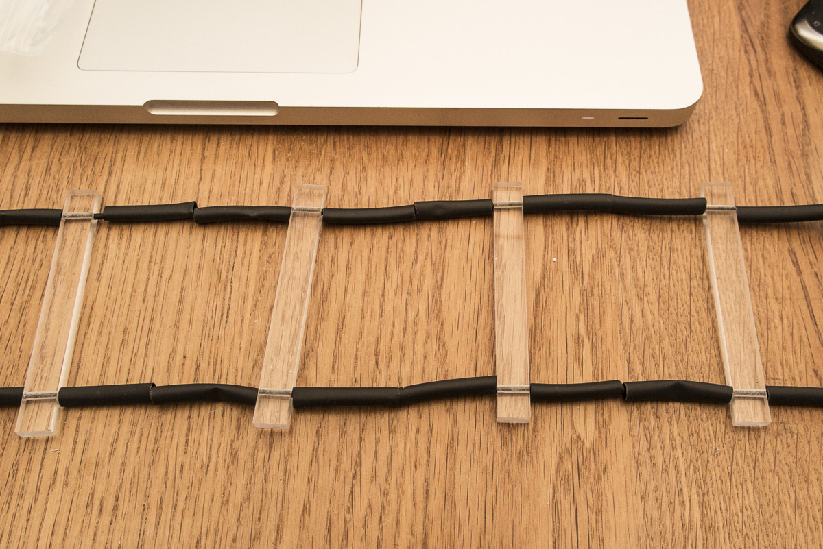 Nun auf die Drähte abwechselnd zwei Schrumpfschlauchstücke a 20mm und ein Kunststoffteil schieben. Dann den Schrumpfschlauch mit dem Heißluftfön schrumpfen. Der Abstand muss so gewählt werden, dass die HL noch stabil bleibt. Das hängt vom verwendeten Draht ab und wird sich zwischen 30 und 60cm einpendeln. Muss man ausprobieren.