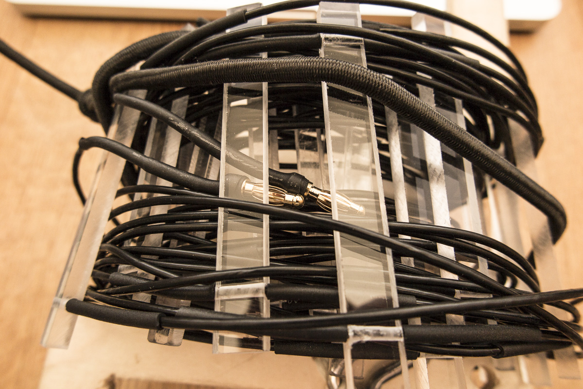 Die Litze ablängen und an den Enden mit Zugösen versehen. Als Mittelteil eine kleine Plaxiglasplatte aussägen und an den Kanten abrunden. Für die HL Schrauben anbringen, hier werden auch die beiden Antennenseiten angeschraubt. Die Antenne bleibt zusammen und wird mit der Plexiglasplatte zusammen aufgerollt. Die HL wird immer abgenommen, damit beim Transport alles heil bleibt.