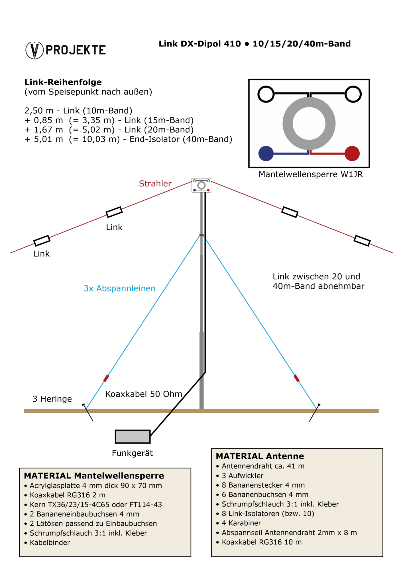 Der Link‑DX‑Dipol 410 ist ein klassischer Halbwellendipol mit steckbaren Bandabschnitten (Links). Er deckt die Bänder 40 m, 20 m, 15 m und 10 m resonant ab – ohne Antennentuner. Die Bauform folgt bewährter Praxis: Inverted‑V am GFK‑Mast, 1:1‑Strom‑Choke am Speisepunkt, Bandwechsel durch Öffnen/Schließen der Links. Am Mast sollte ein Aufholseil mit Rolle genutzt werden.