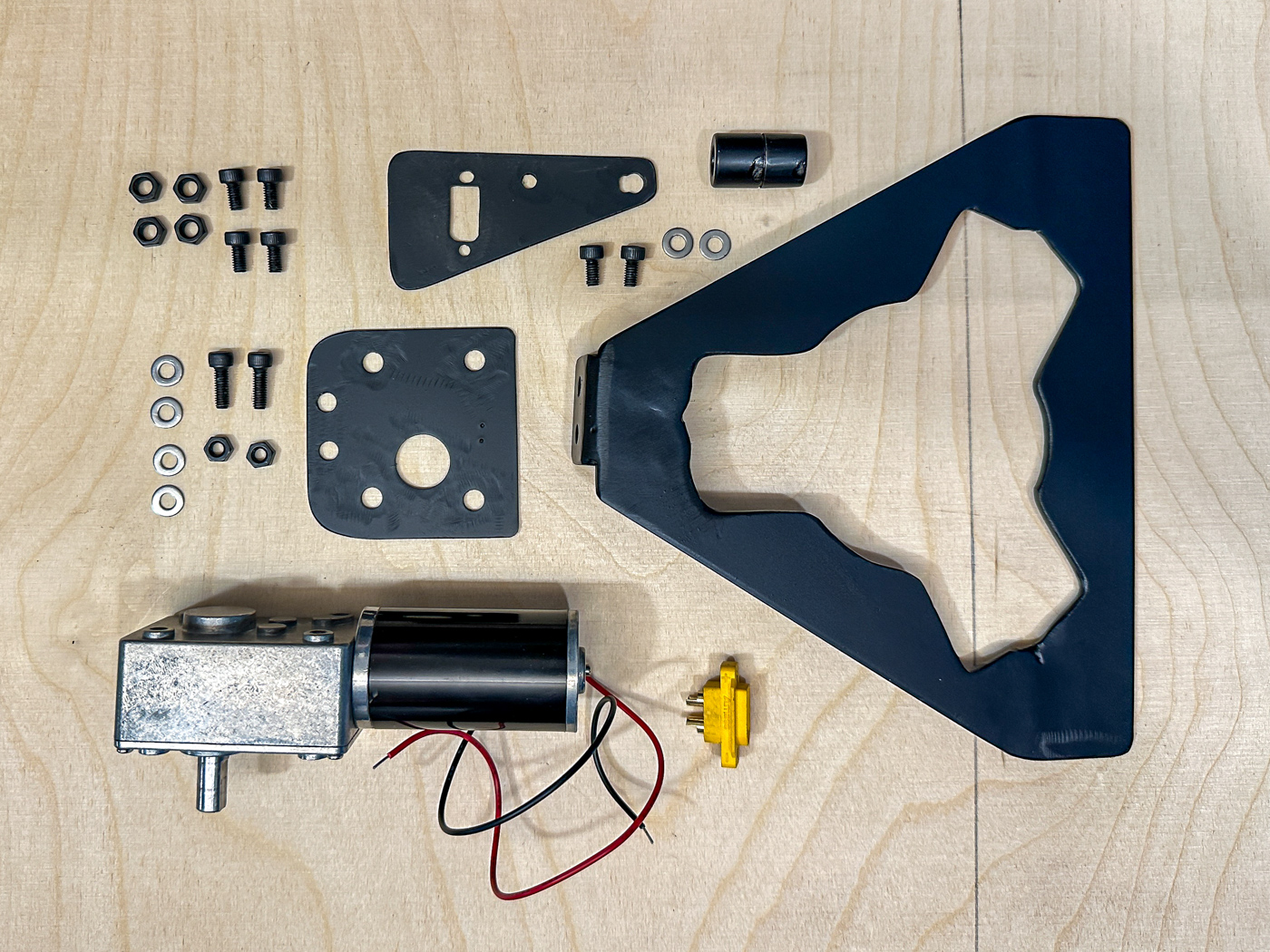 - Getriebemotor: Typ 5840-31zy, Schneckengetriebe, 12V/24V Gleichstrom, 7-470 U/min, idealerweise ca. 16 U/min (bis 40 U/min sind möglich); kostet ca. 15 Euro