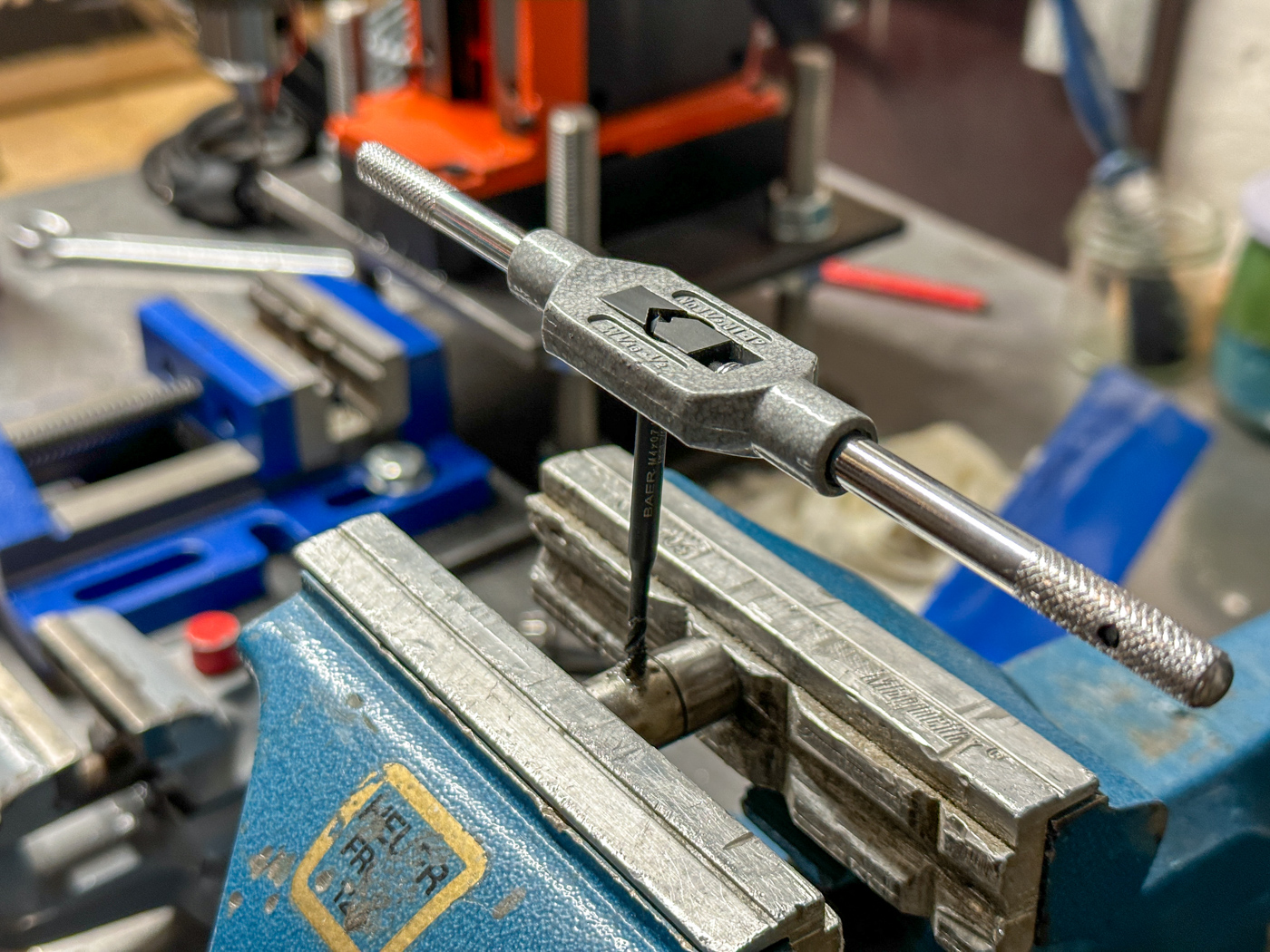 - Seitliche Gewindebohrung: Ein 4 mm Gewinde seitlich in die Nuss schneiden, um die Achse des Motors mit einer Festklemmschraube zu fixieren.