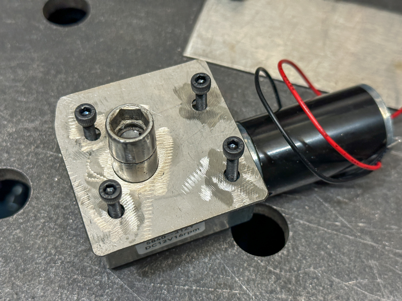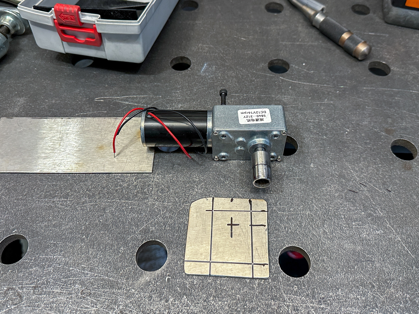 - Bohrungen für Motor anbringen: Vier Bohrungen für die Befestigung des Motors anbringen sowie eine größere Bohrung für die Antriebsnuss.