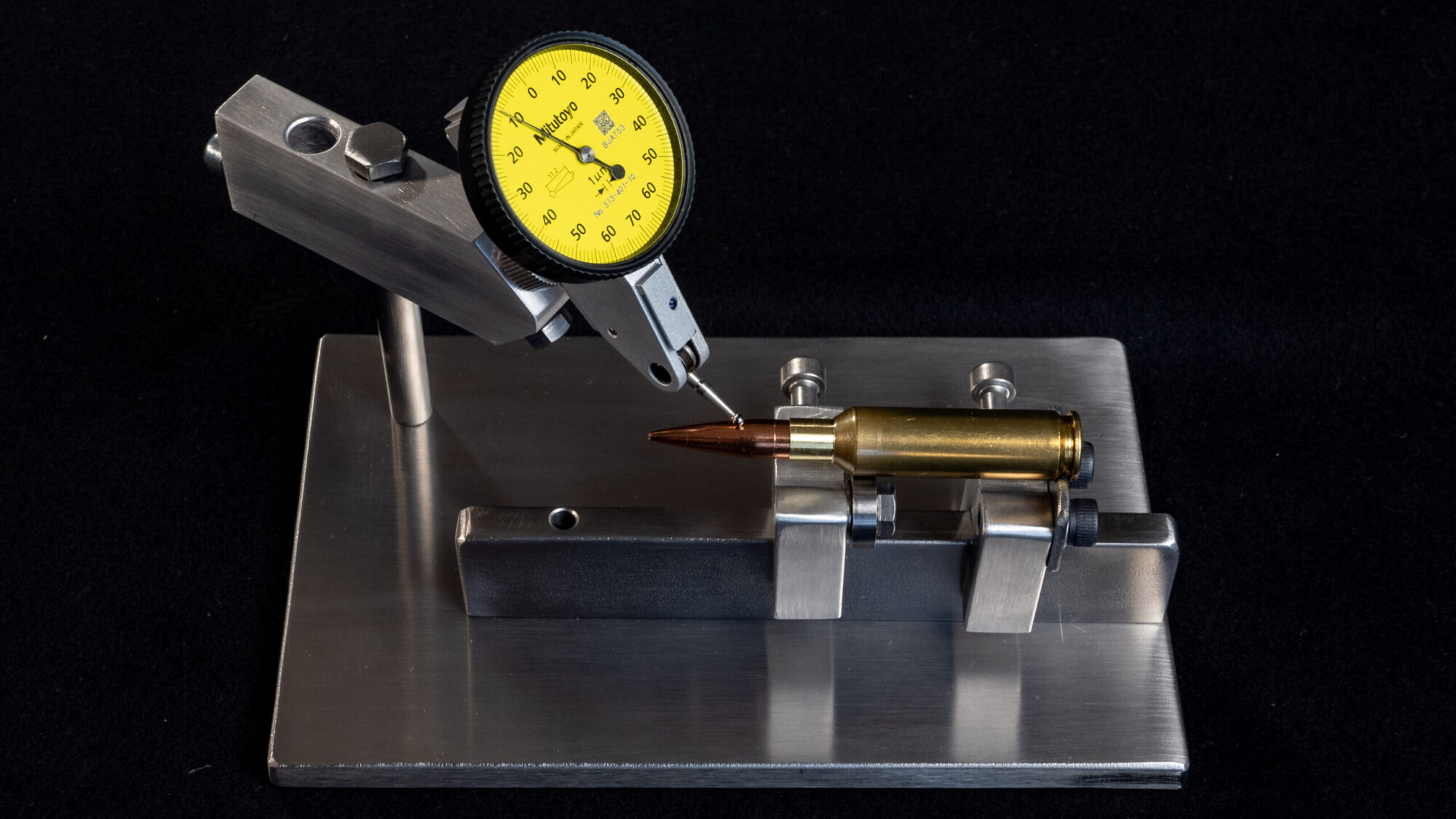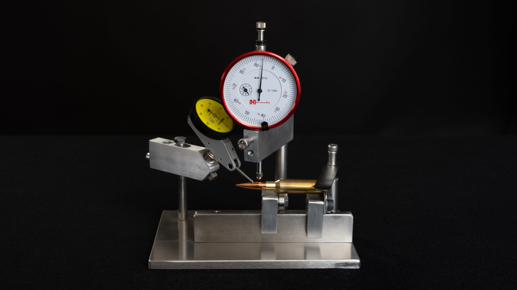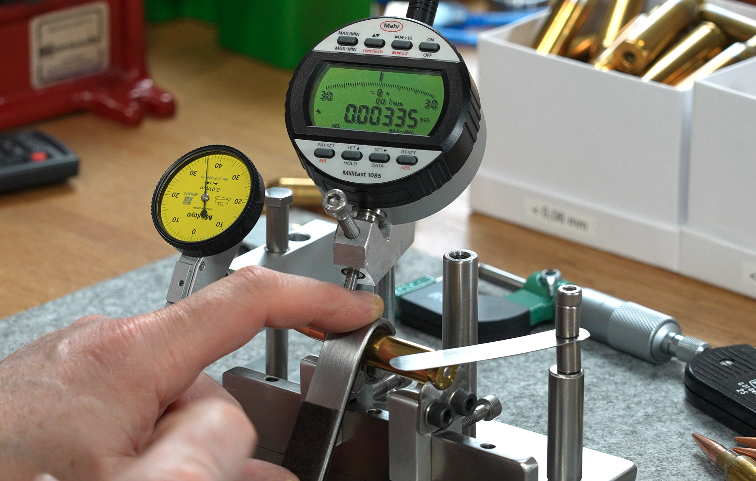 Für die Außenmessung können alle drei Uhren verwendet werden. Sehr komfortabel ist die Messung mit der digitalen Millitast 1085, da es dort vielfältige Einstellungen gibt für eine schnelle Messung. Dadurch werden Messfehler reduziert. Im nachfolgenden Bild wird der Geschossrundlauf gemessen. Dabei sind beide Niederhalter im Einsatz.