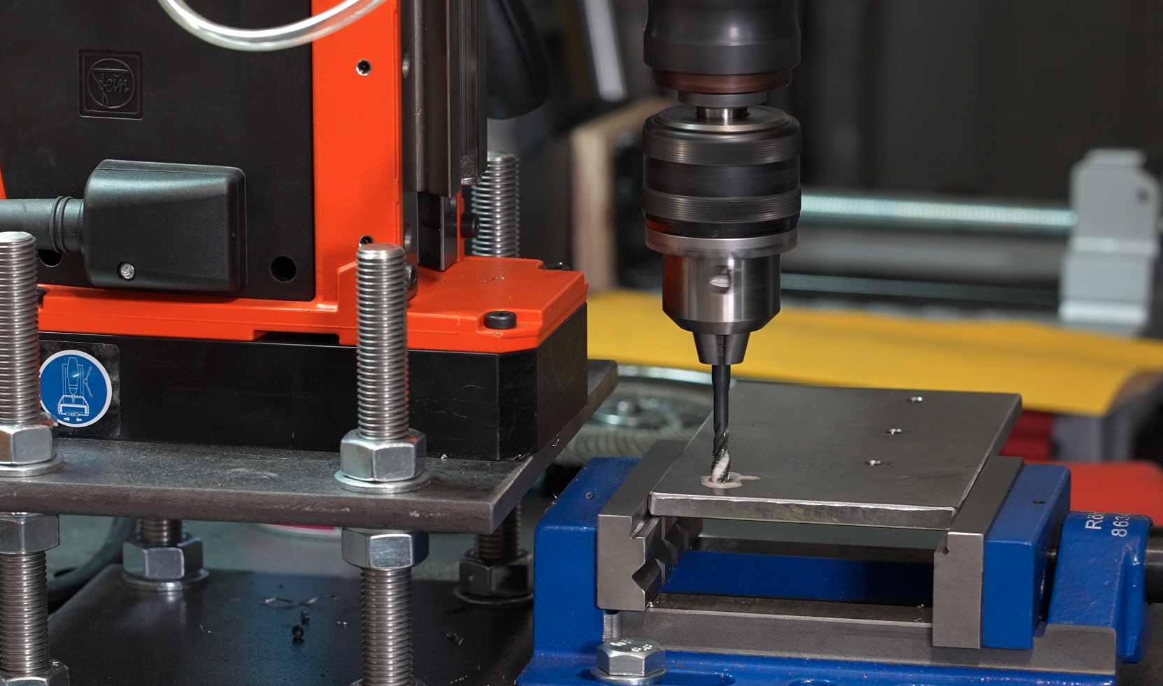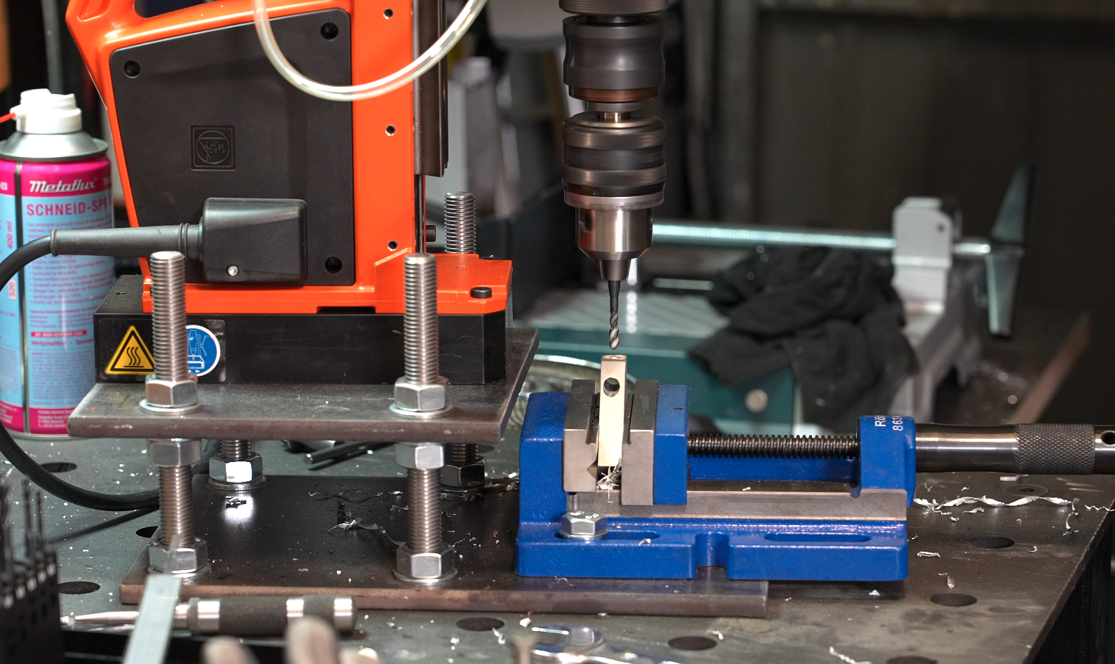 Die Grundplatte aus Edelstahl trägt die Klemmbasis aus einem Edelstahlprofil. Diese ist von unten mit der Grundplatte verschraubt. Auf der Klemmbasis können verschiedene Auflageböcke angeschraubt werden. Sie können sowohl in der Höhe, sowie auch in der Lage verstellt werden. Die höhenmäßige Ausrichtung ist natürlich begrenzt und wird nicht empfohlen, da dann keine obere Auflage auf der Klemmbasis vorhanden ist. Die Grundplatte wird gebohrt und es werden Gewinde M5 und M6 geschnitten: