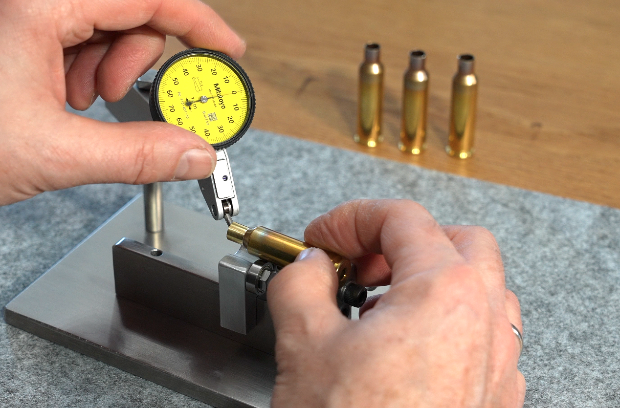 Mit der Fühlhebeluhr können Hülsen am Hülsenmund innen ausgemessen werden, um die Rundlaufabweichung festzustellen: